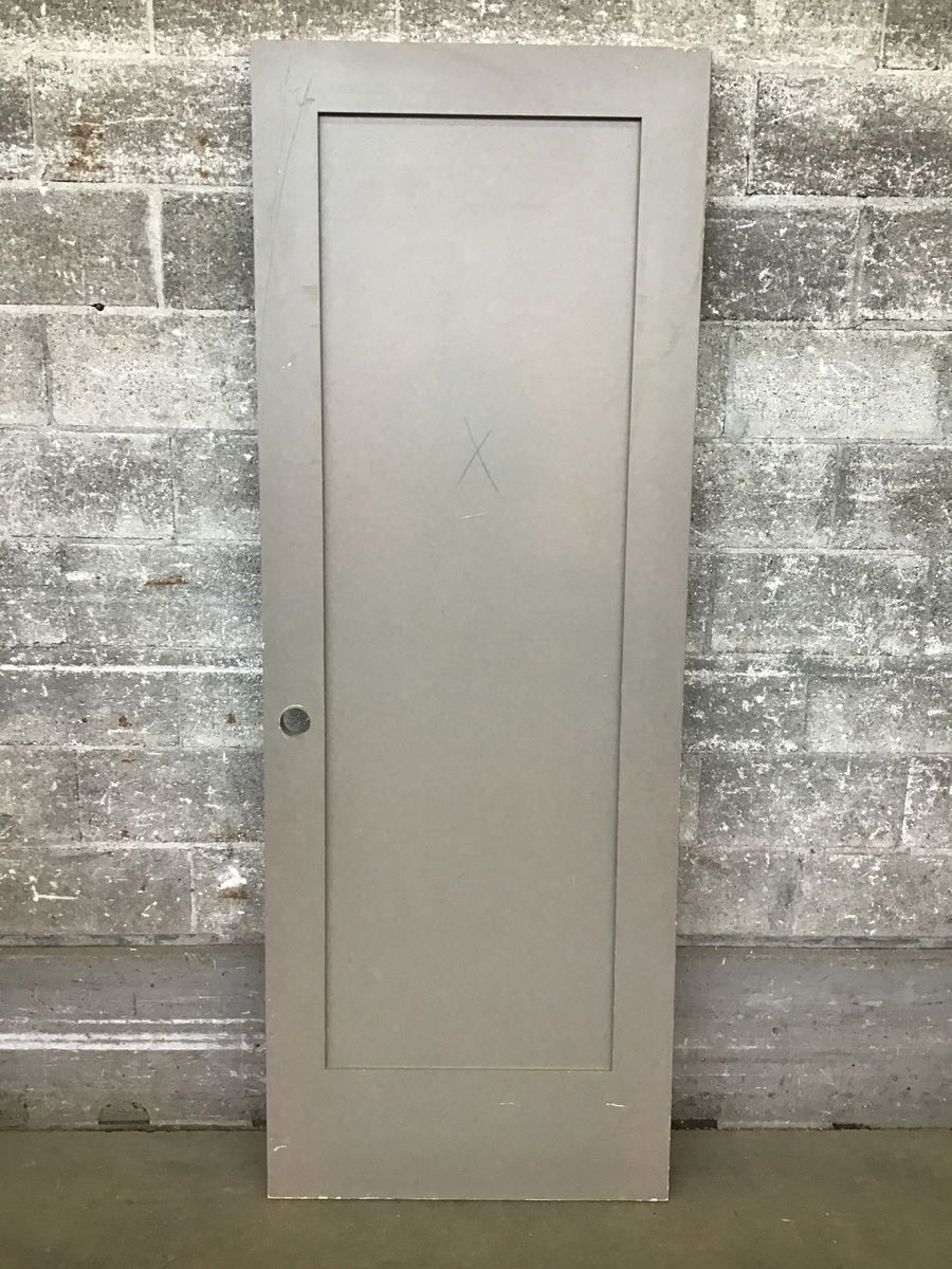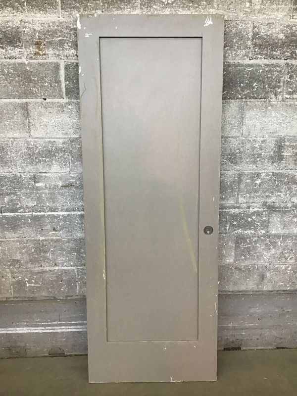 A single panel interior door with a painted medium grey finish. This would make a good bedroom door.