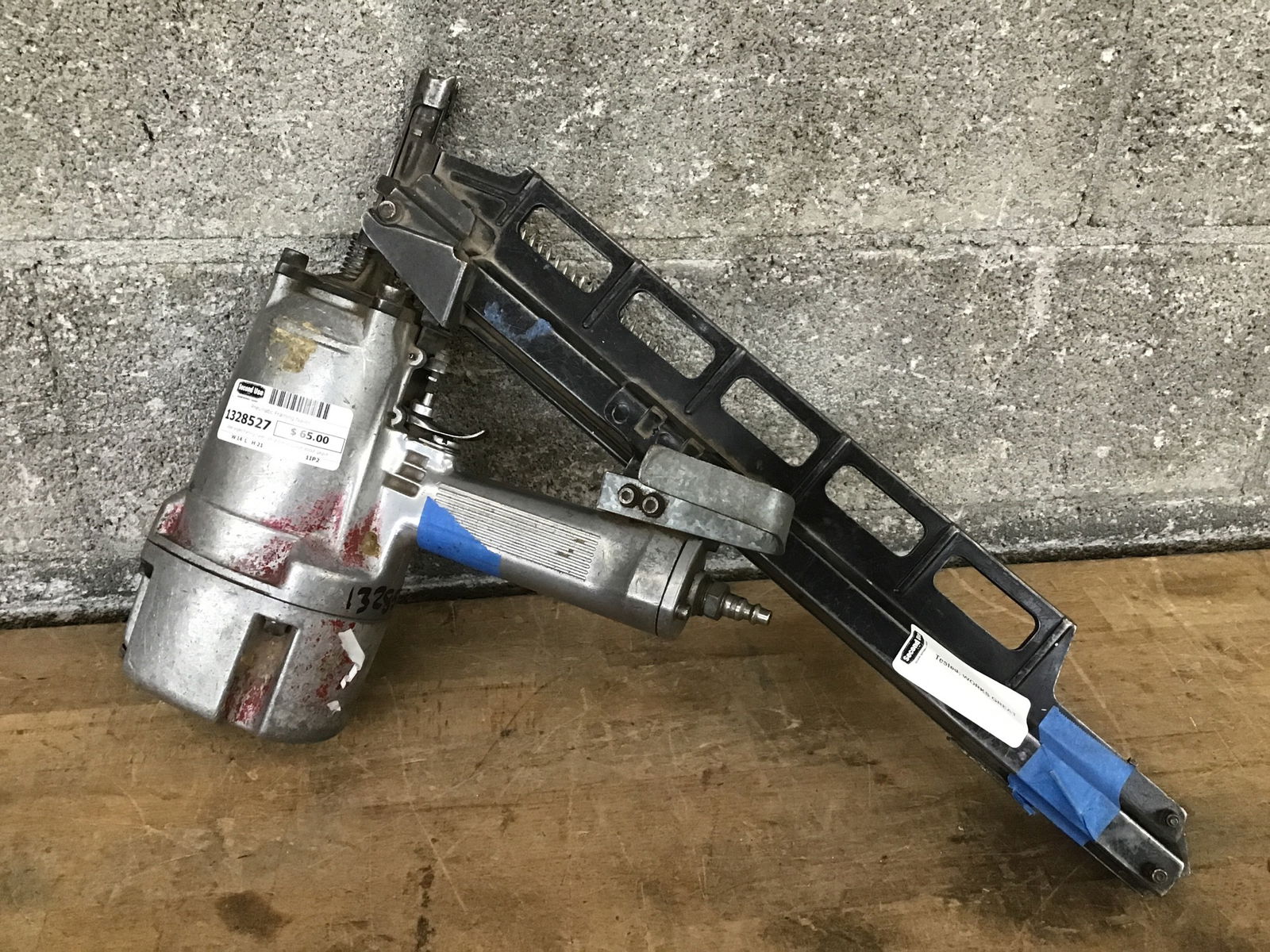 Older angled framing nailer. All of the language about gauge sizes and what not has worn away but this thing works amazing.
