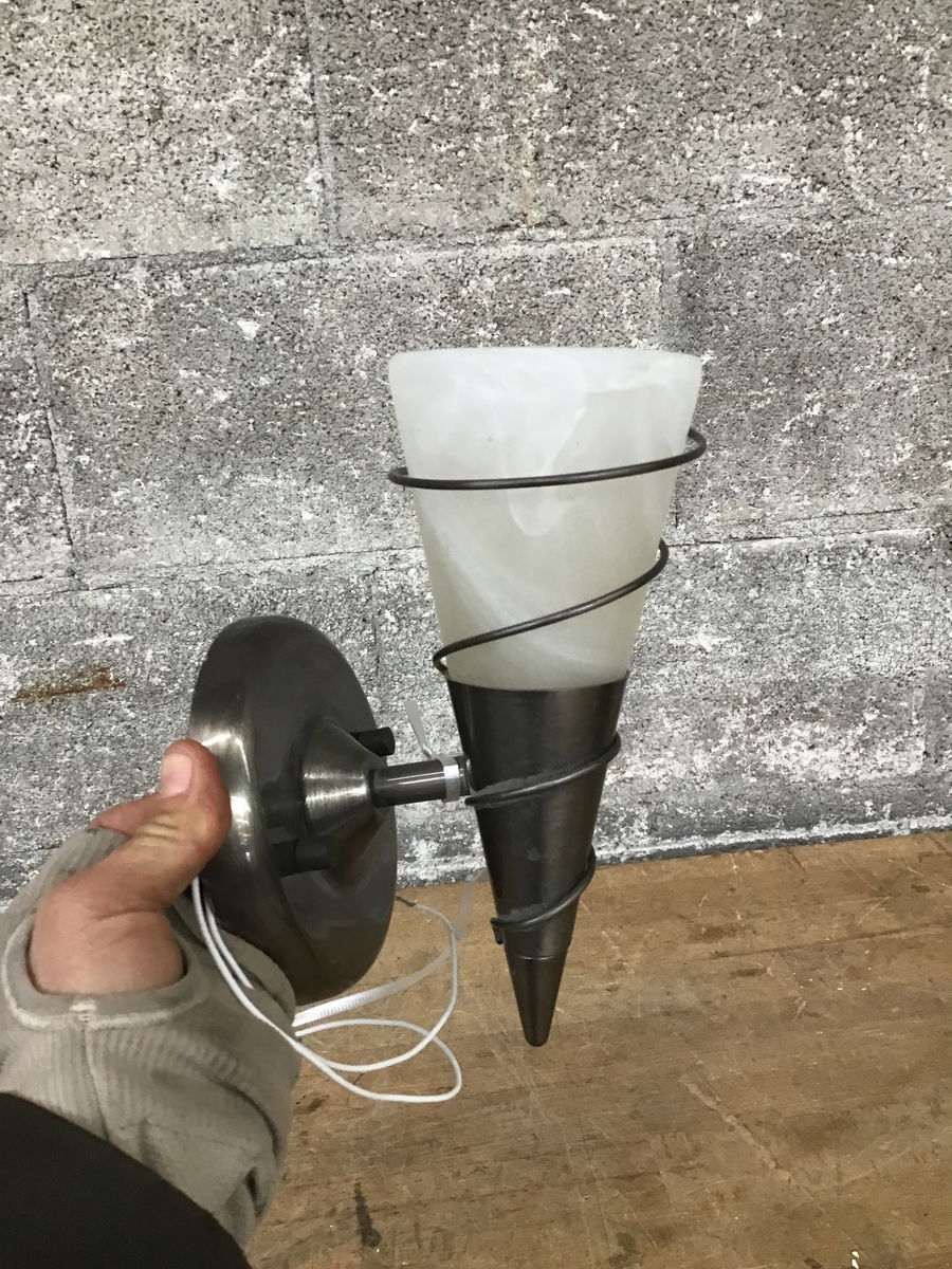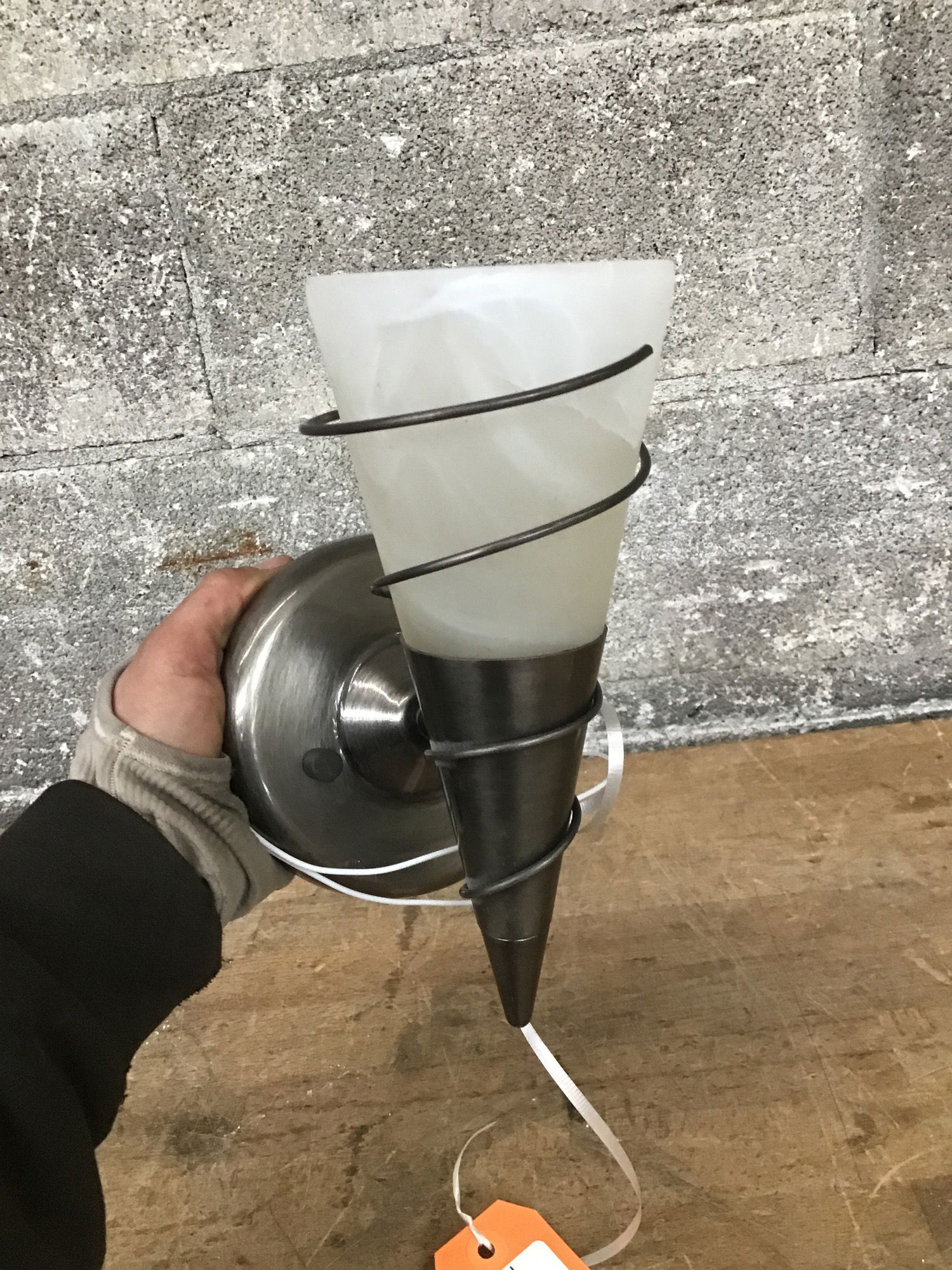 A classy wall sconce with a brushed steel finish to its construction to accompany the alabaster fitter, all designed to be a modern take on the classic mead-hall horn sconce vibe.