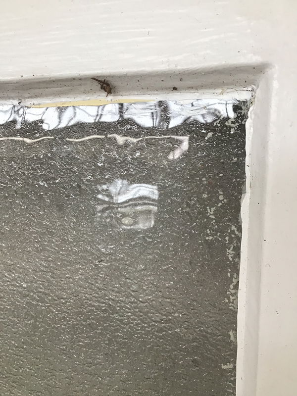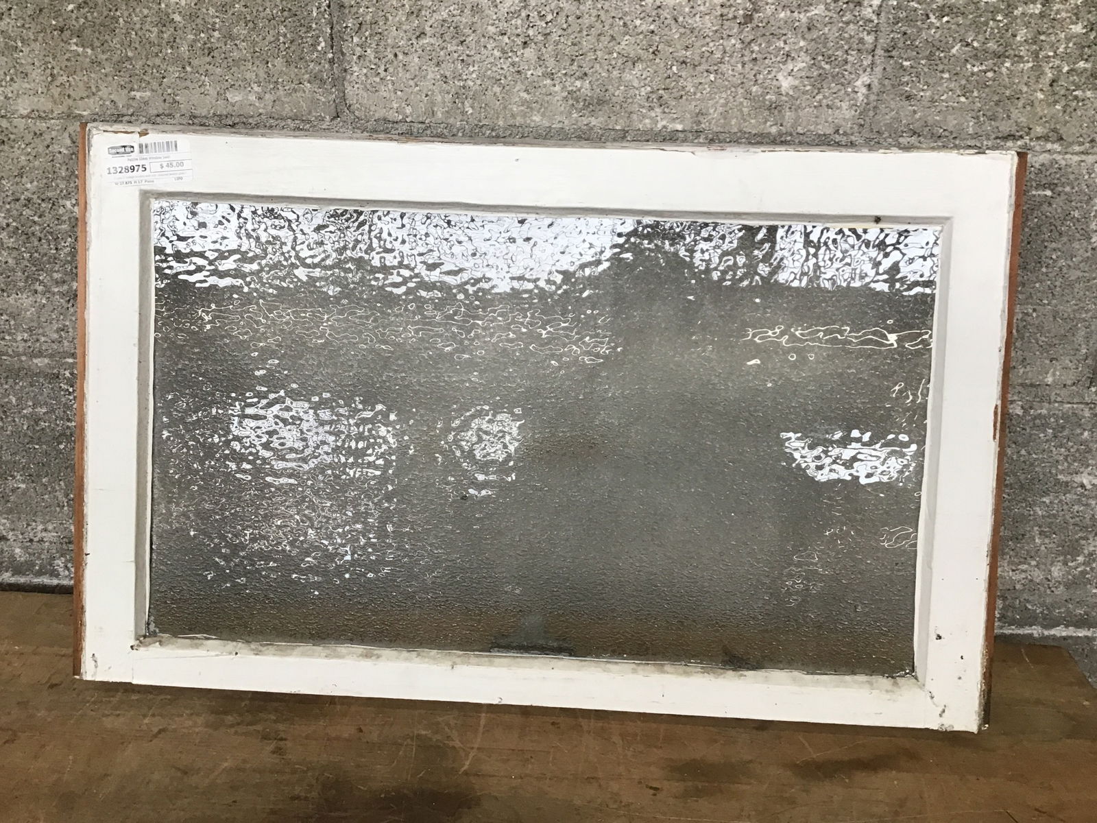 A cute li'l vintage window sash with obscured pebble glass that looks to be in good shape.