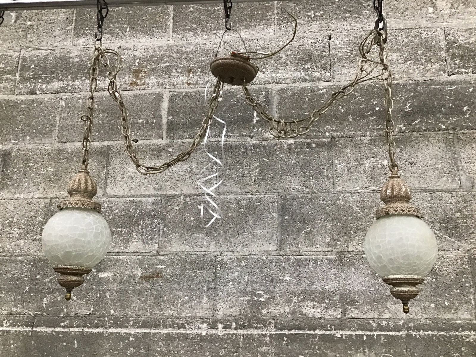 A vintage pendant light fixture which has two pendants hanging from its canopy by chain. The pendant features a pair of lantern-shaped pendants, which have crackly glass fitters around their bulbs, while the fixture's construction sports a finish that's a lot like a pink sandstone. The sticker inside the canopy that lets us know it was tested and approved by the Underwriter's Lab also tells us that this is a product of Moe Lighting.