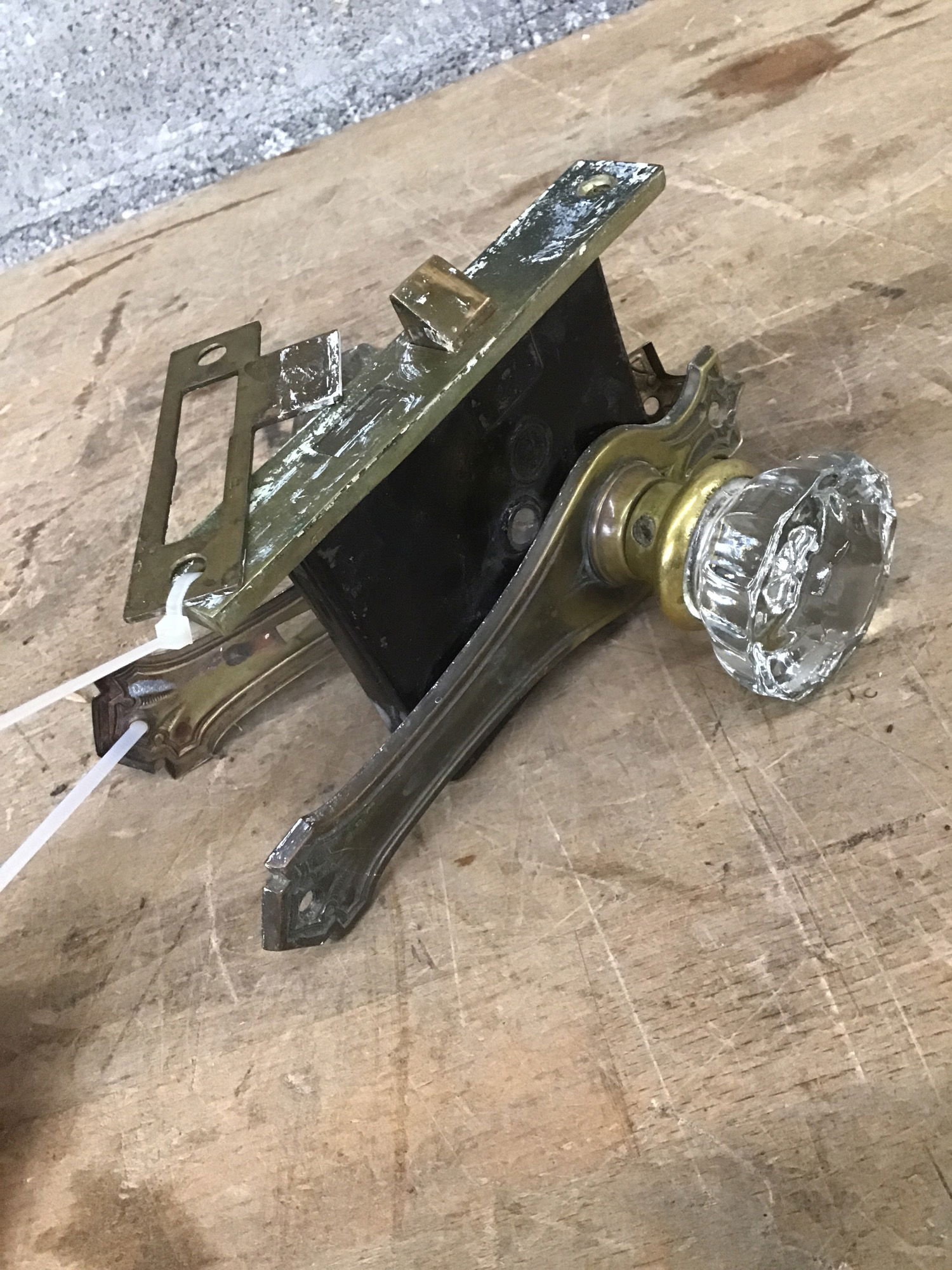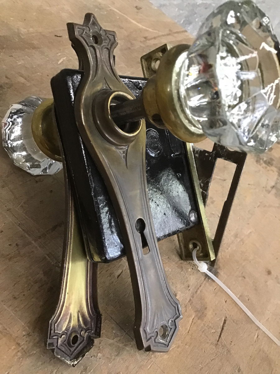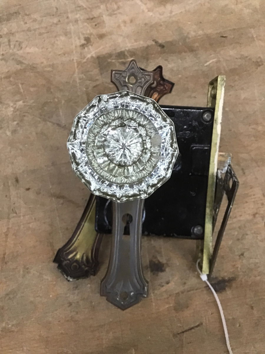 Vintage glass door knobs that come with a functional mortise, strike plate and some dramatic escutcheons with a cross like design on the top. Dimensions listed are for the escutcheons.
