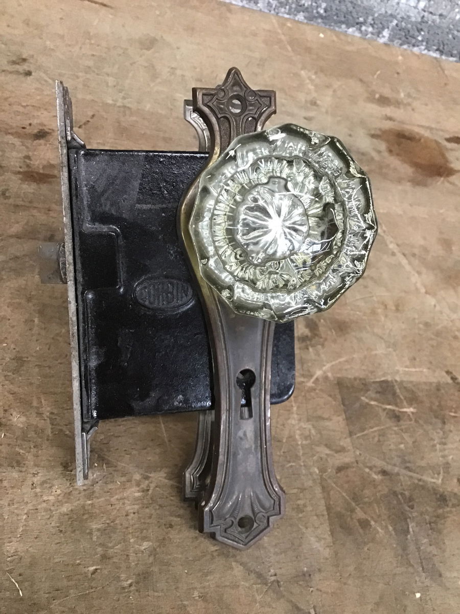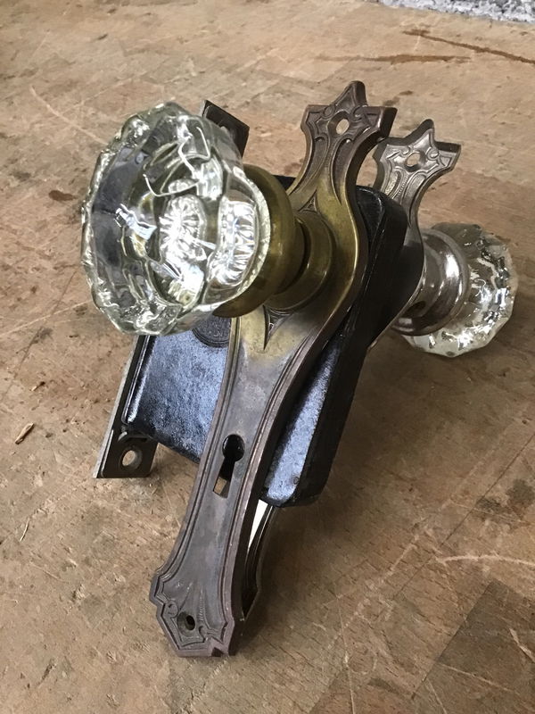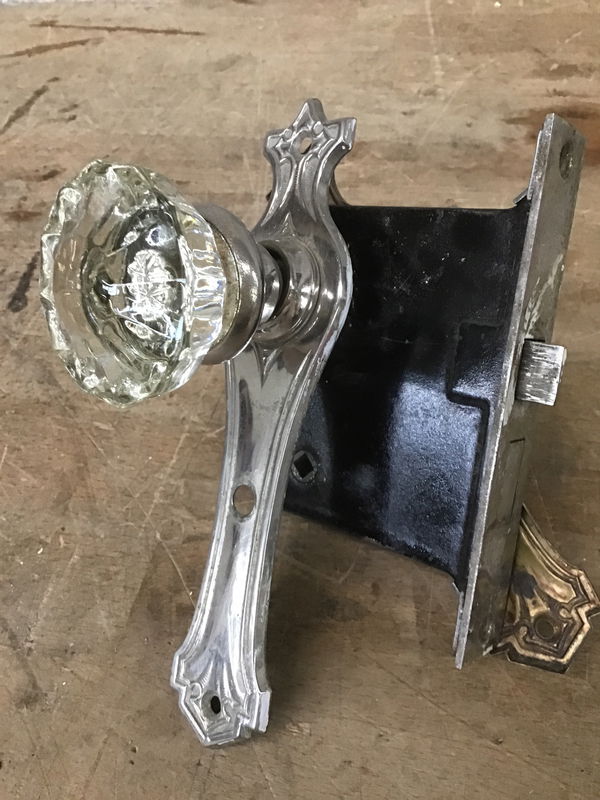 Vintage glass door knobs that come with a functional mortise and some dramatic escutcheons with a cross like design on the top. One is brass finished, the other nickel. The brass escutcheon is a tad bent but should straighten out once mounted. Dimensions listed are for the escutcheons.