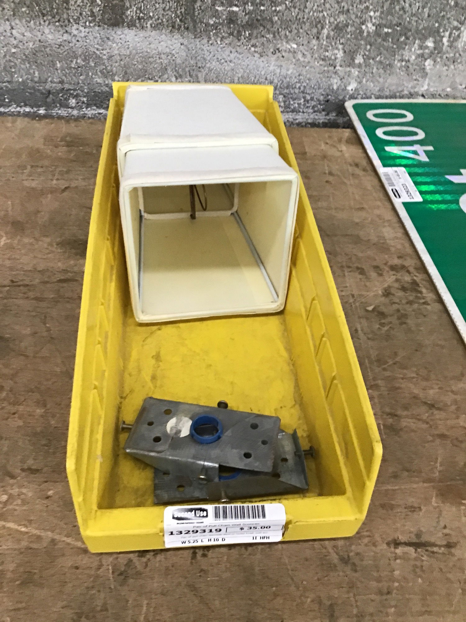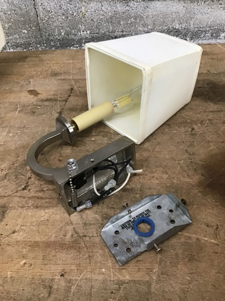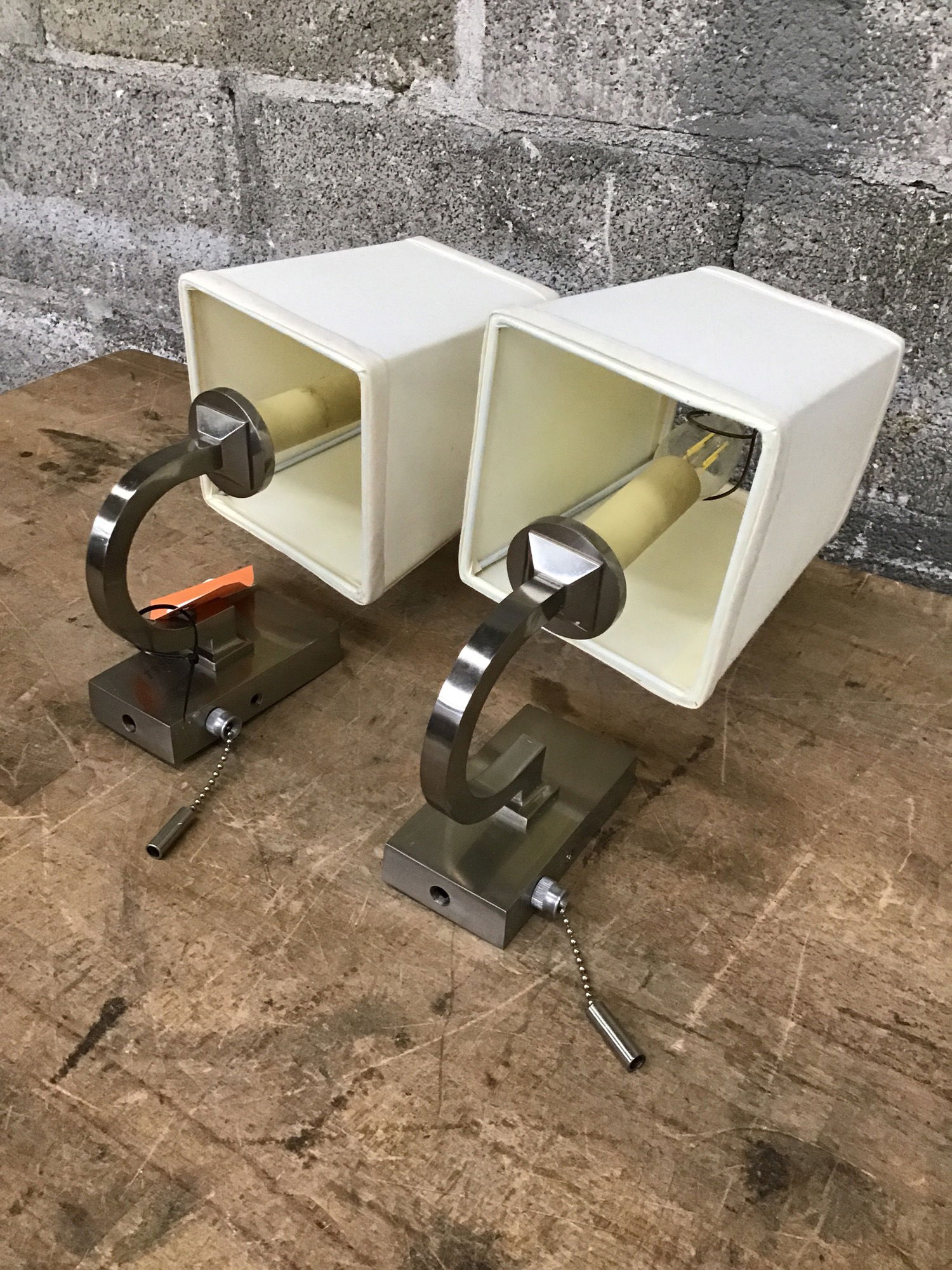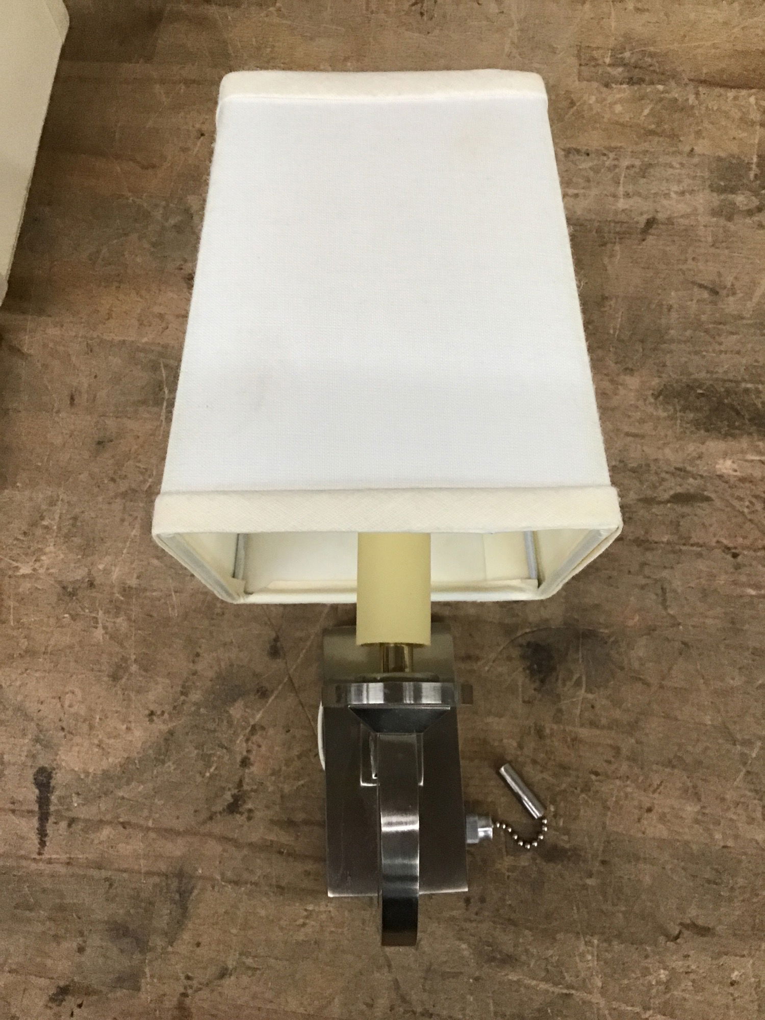 Pair of pull chain stainless steel or nickel finish wall sconces with fabric shades. They come with their mounting plates, which are at Customer Service along with the fabric shades.