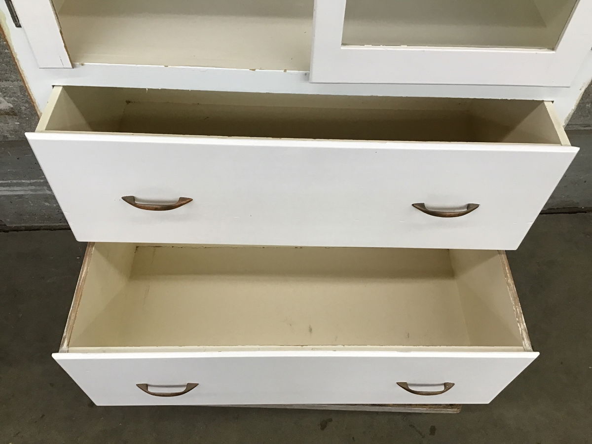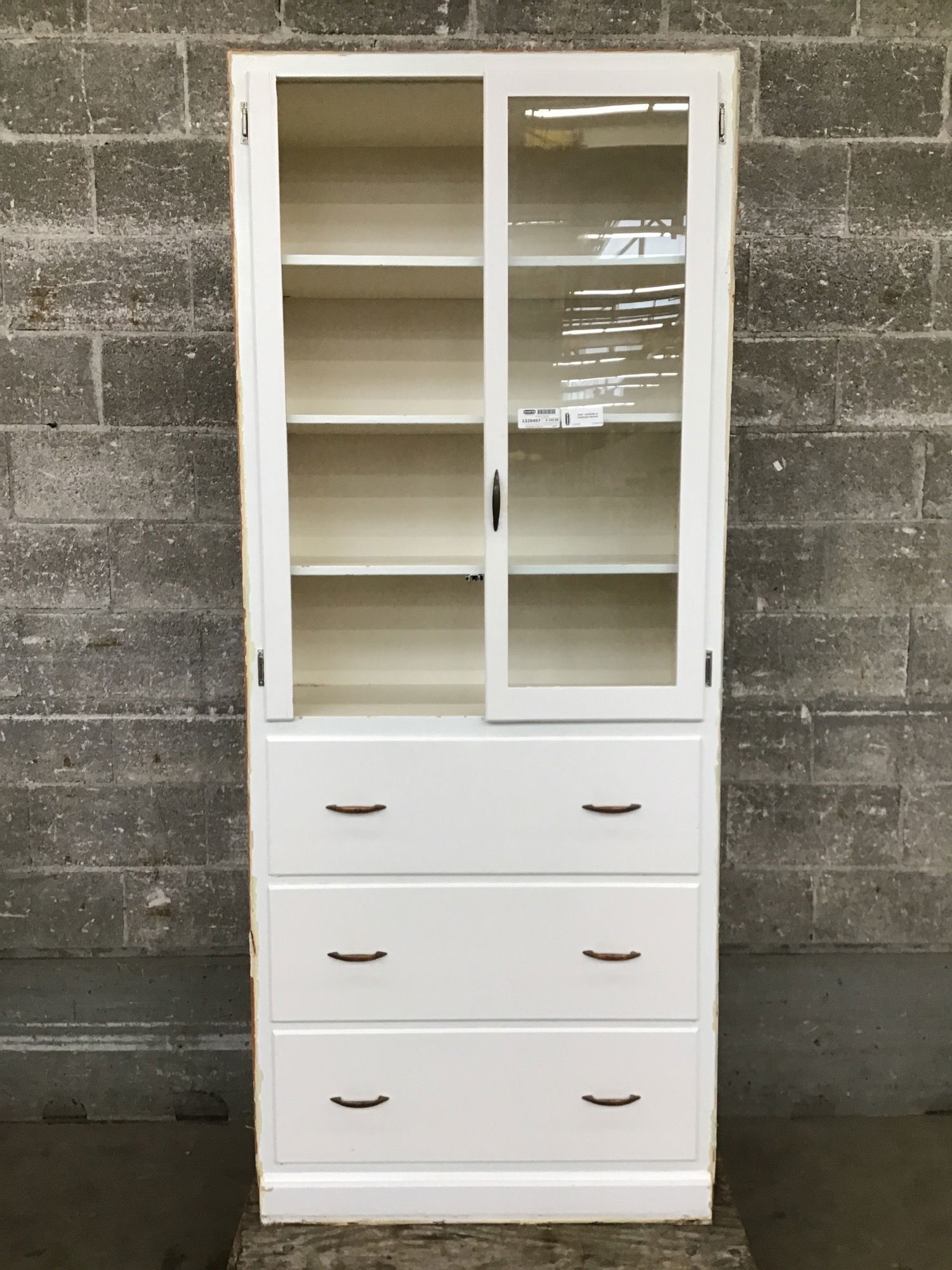 This sturdily constructed built-in cabinet features a plywood box, three drawers, fixed shelving and coppery pulls with a subtle mid-century vibe. This is clean and in great shape except for one of the doors, which will need some time with glue and clamps to become whole once more.