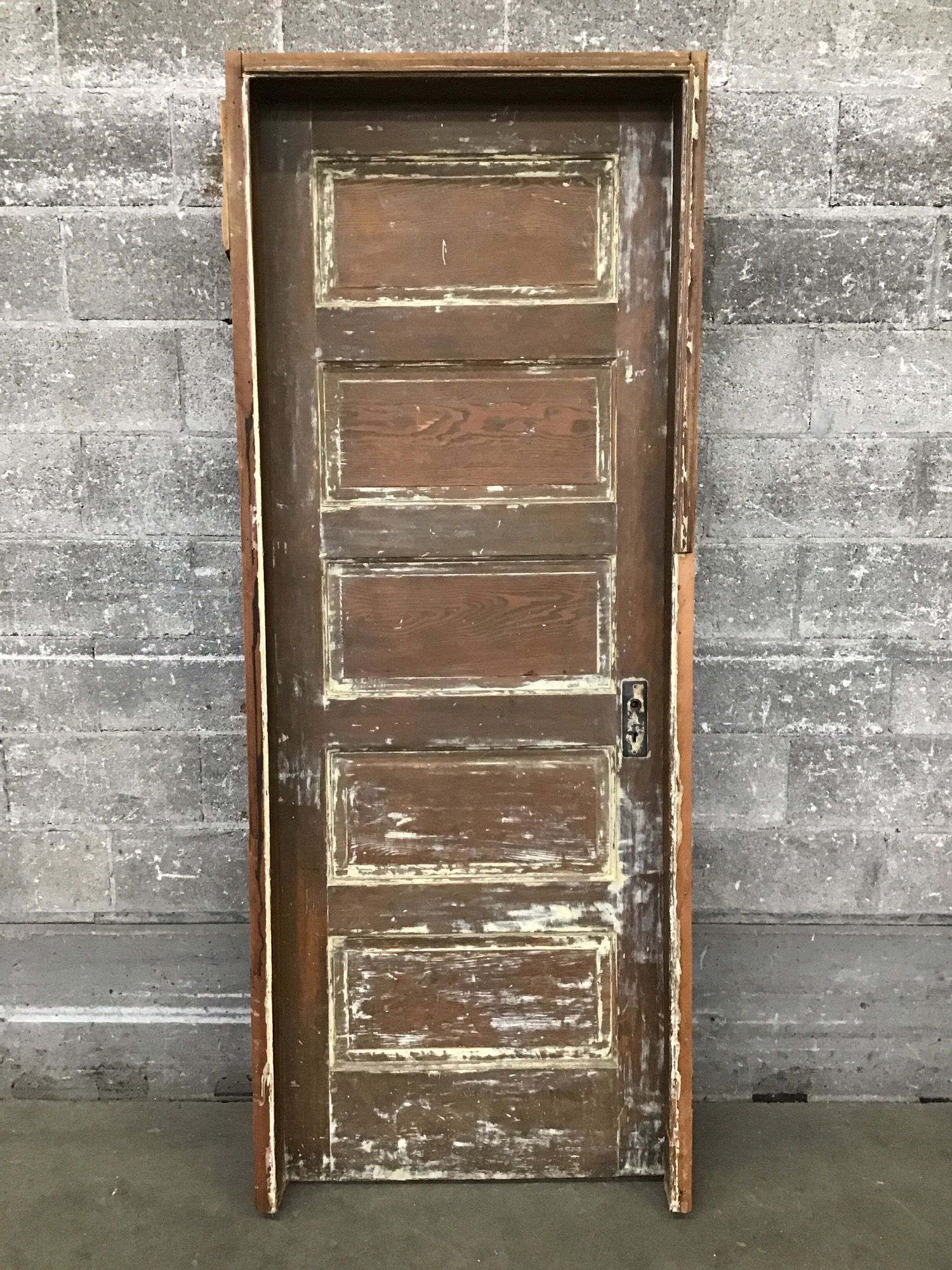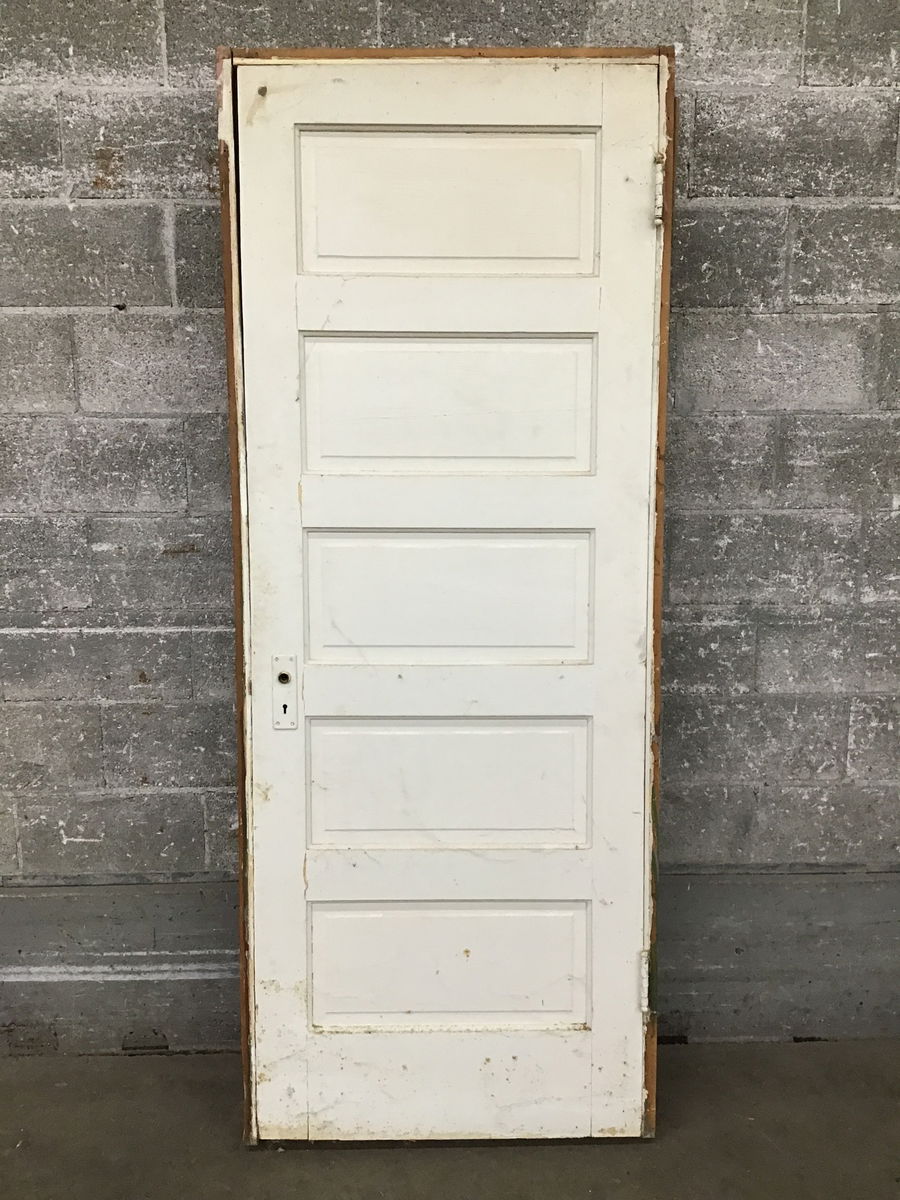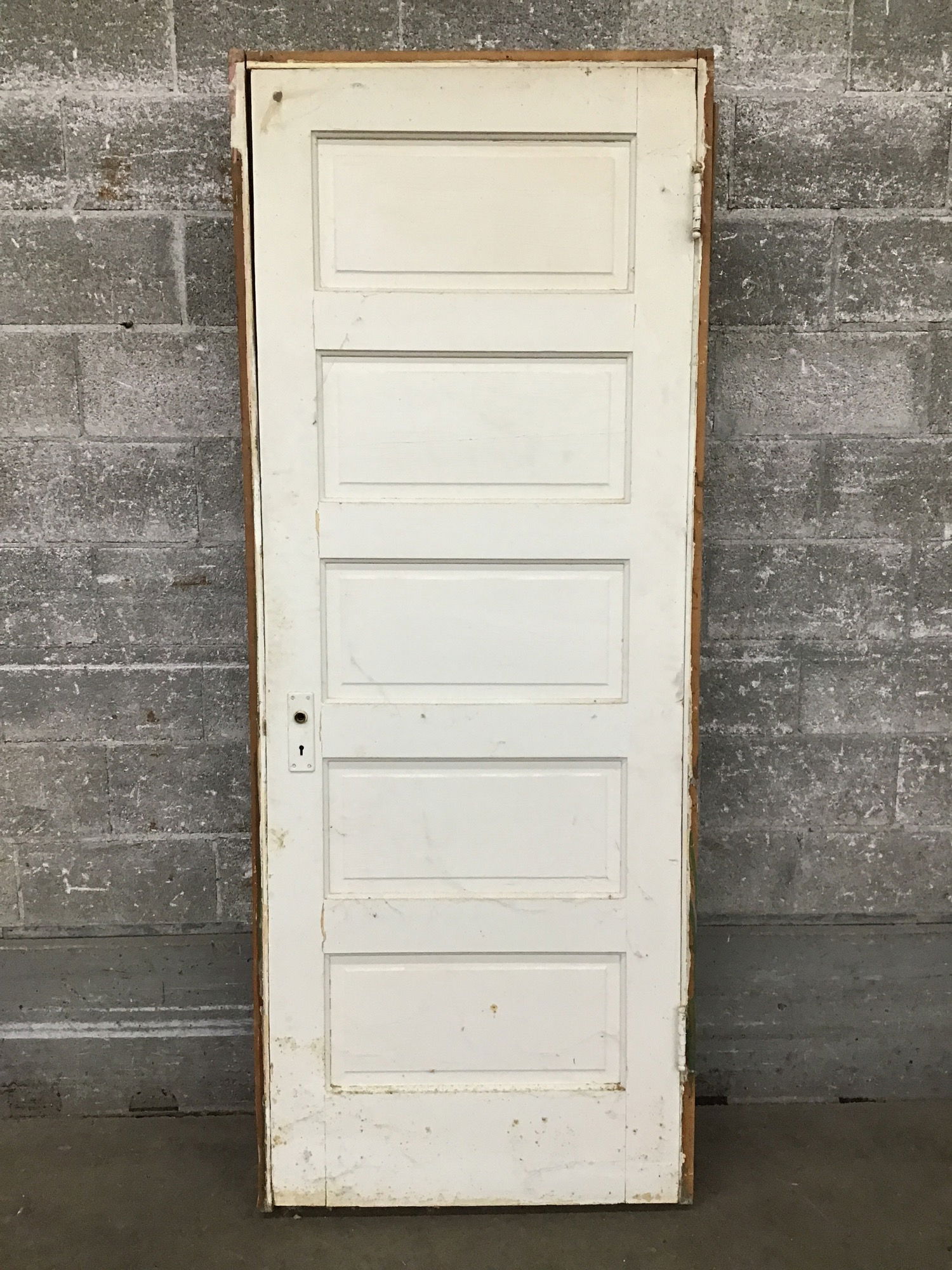 Vintage, painted raised five panel interior door with a couple coats of paint.