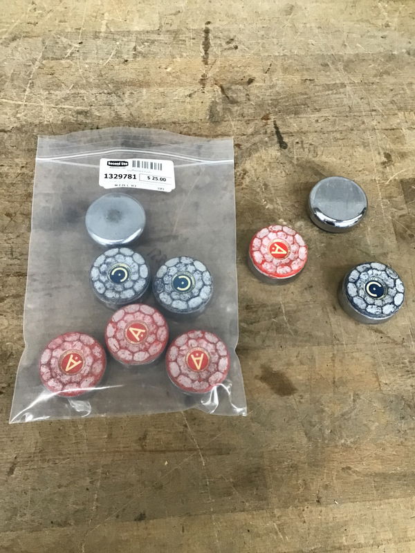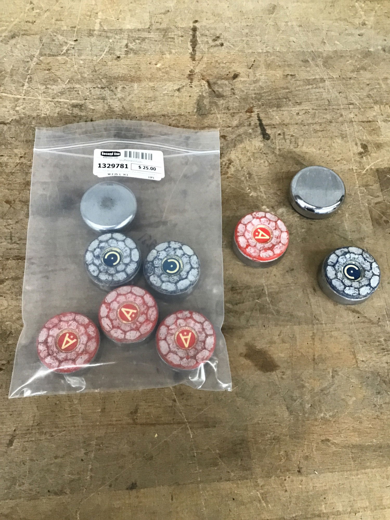 Full set (plus one bonus blue!) of shuffleboard pucks that have seen a lot in their lives thus far. Still a good usable set. Maybe you should use these as the excuse to snag some bowling lane and make yourself a home shuffleboard table??