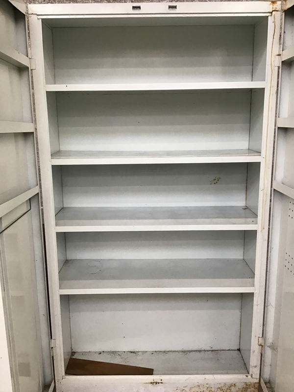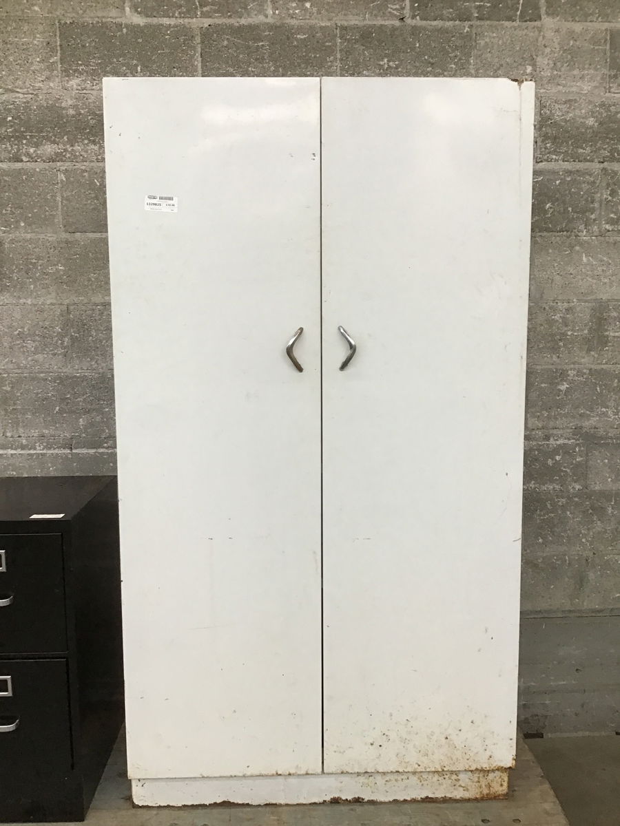 ONE DOOR IS DAMAGED AND WILL NEED REPAIR. A shop cabinet with a white paint job and a pair of MCM Chevron handles. It has four fixed-height shelves inside and has many years of hardy work left in it.