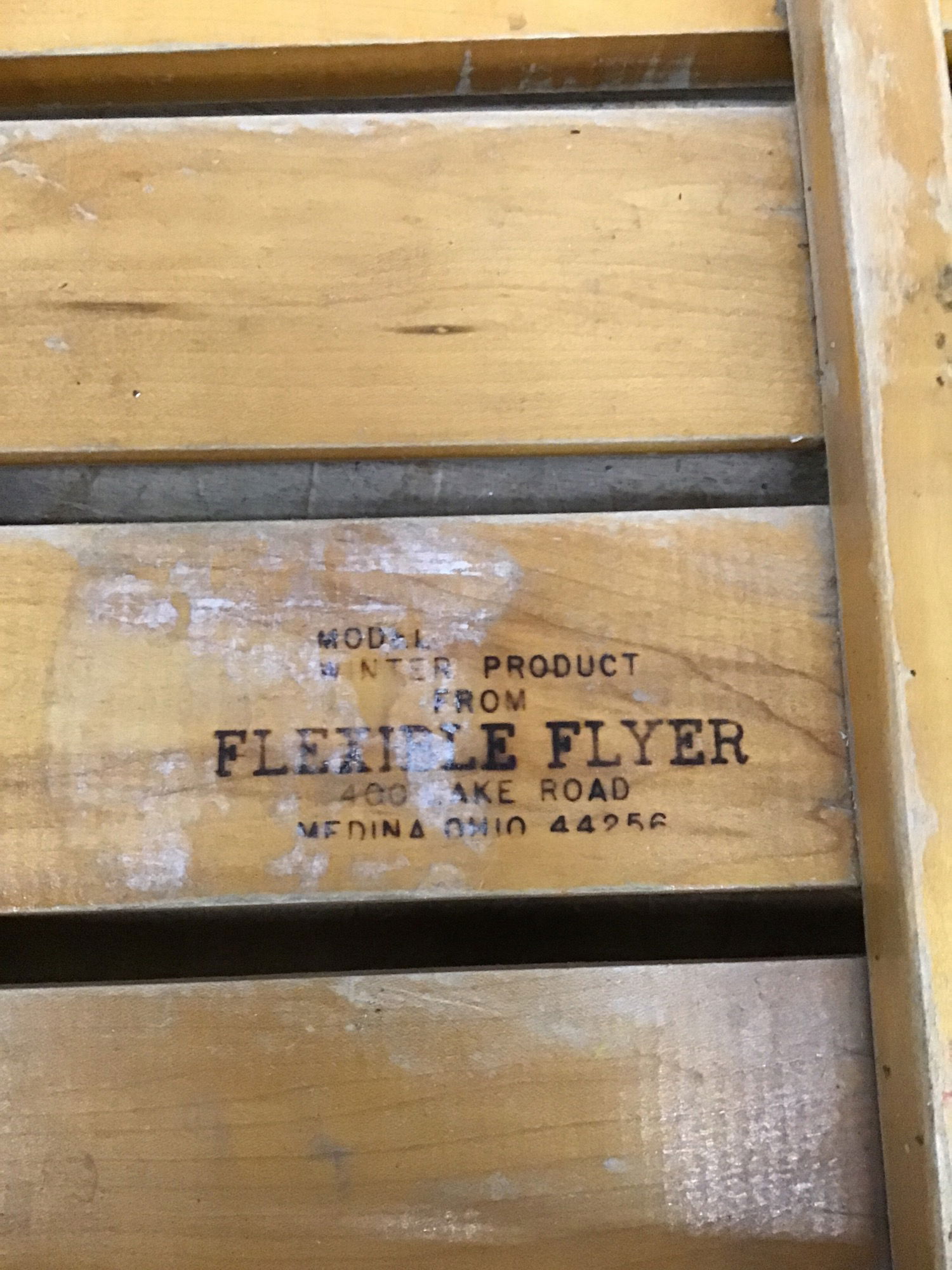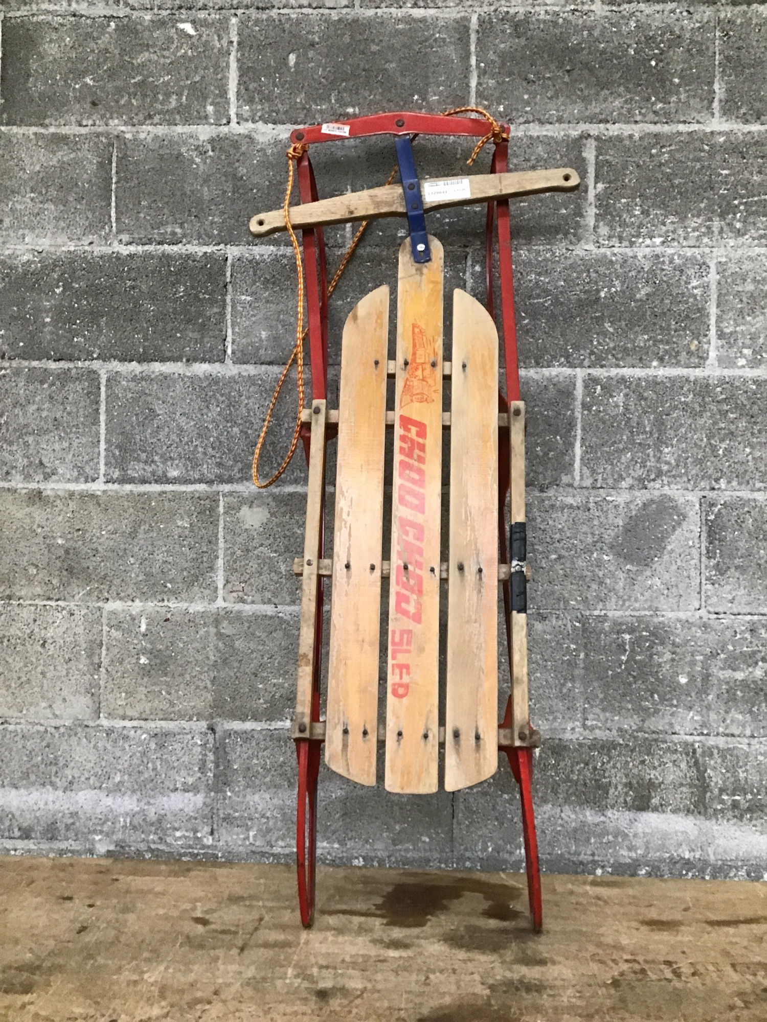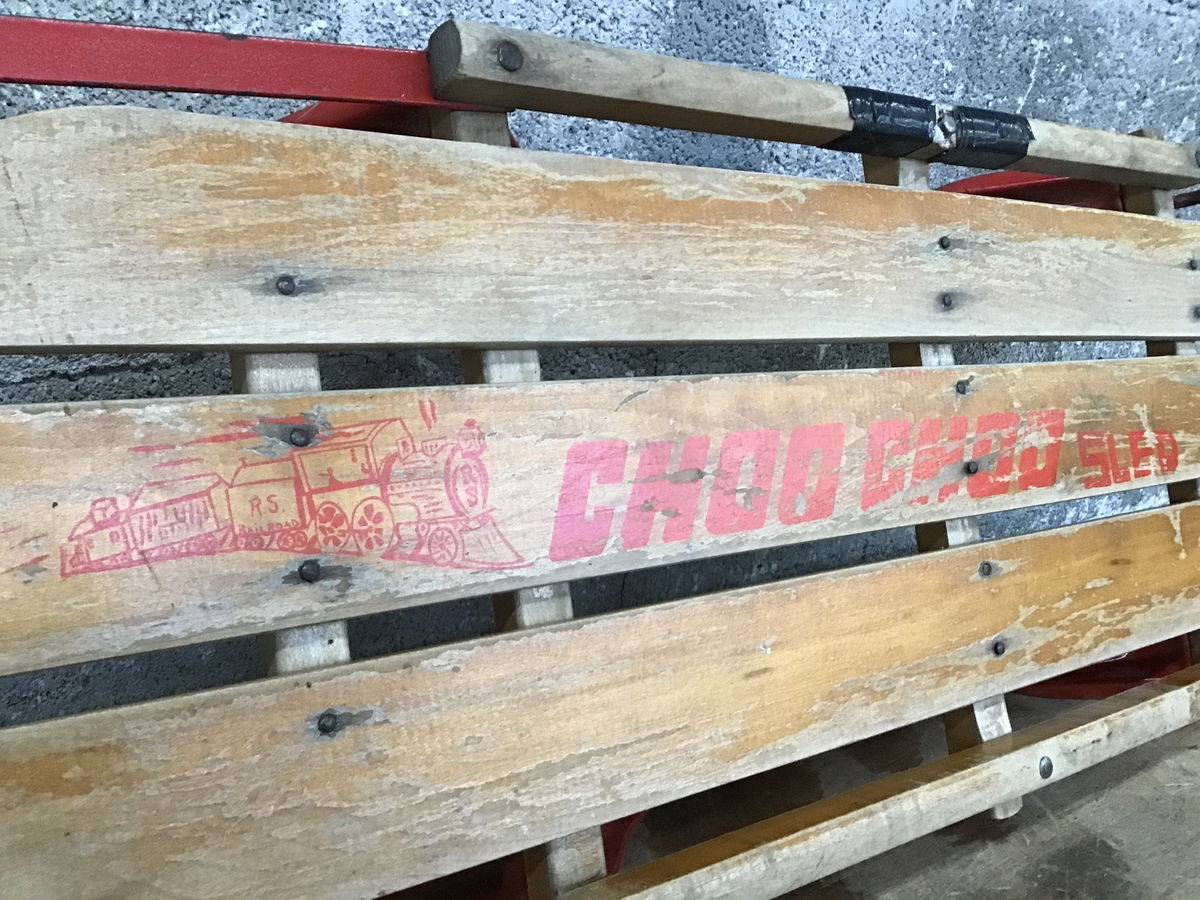 A vintage Choo Choo sled, manufactured by Flexible Flyer in Medina, Ohio, that looks to be in great sledding shape. Manufactured in either the '60s or early '70s, as the sled has the maker's mark stamped on the other side with the Medina address, which they stopped using in the early '70s.
