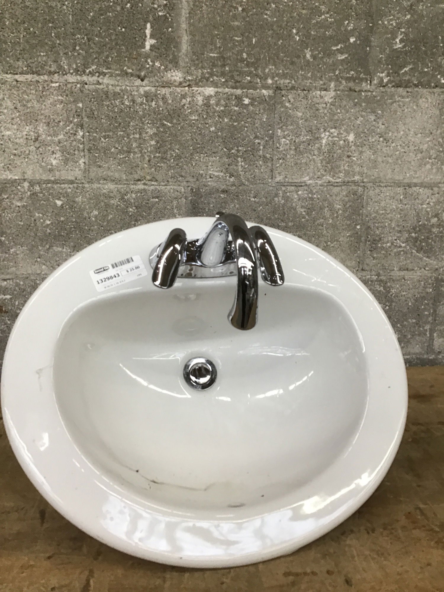 A good ol' fashioned bathroom sink in good condition, complete with a faucet, ready for use.