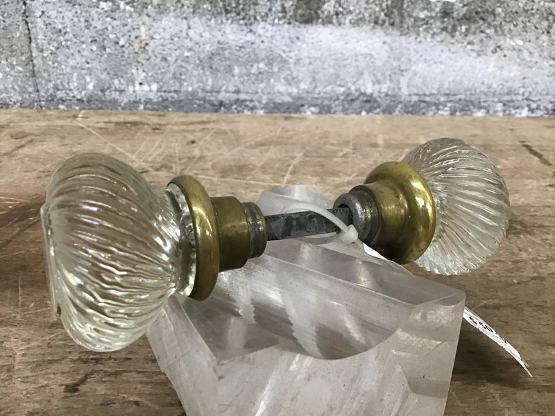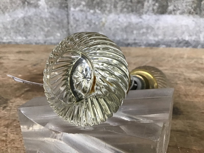A pair of vintage glass knobs with a lovely swirl texture and floral medallion inside. Has a fixed spindle.