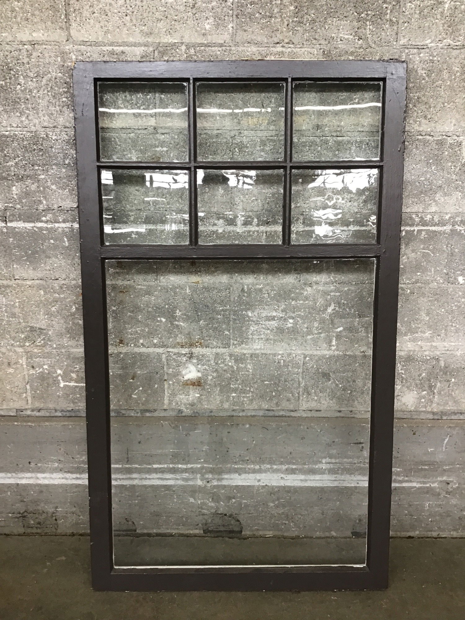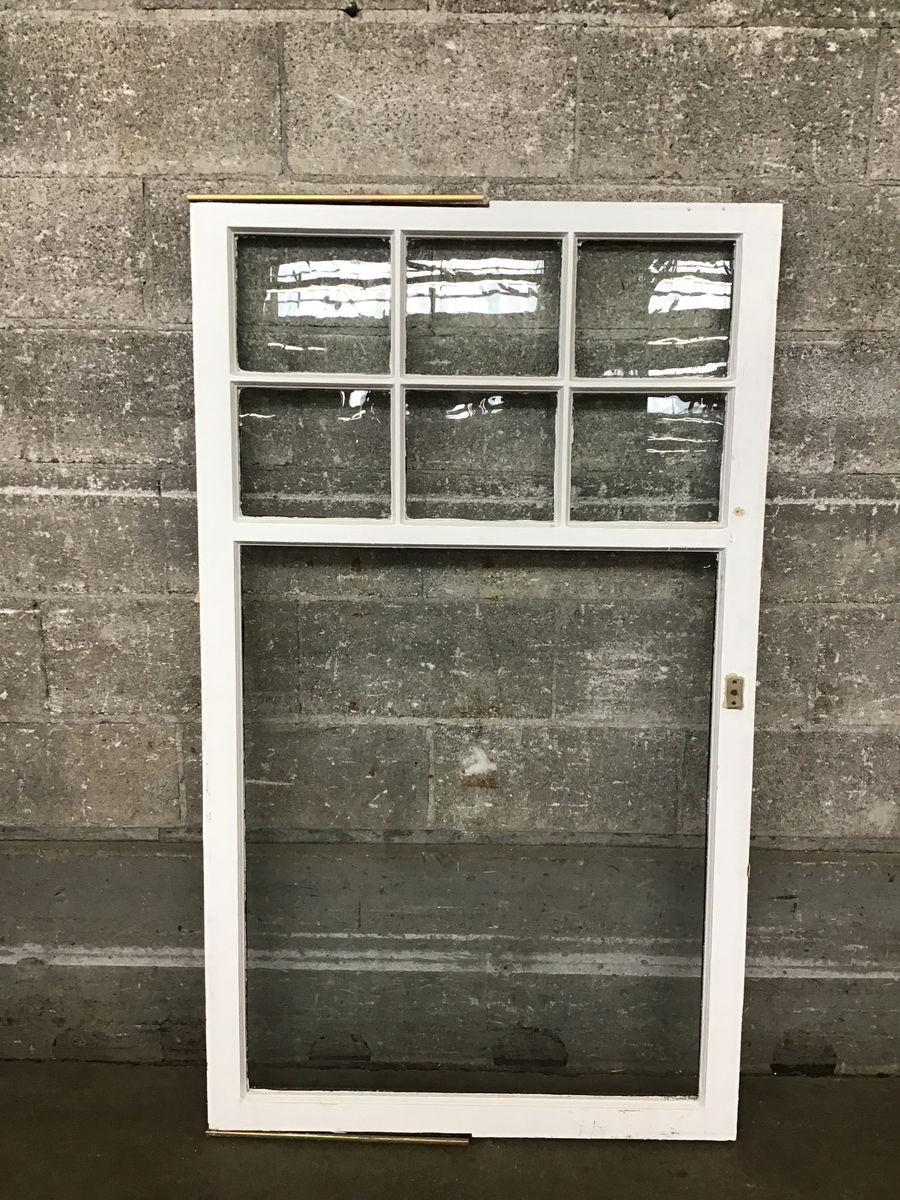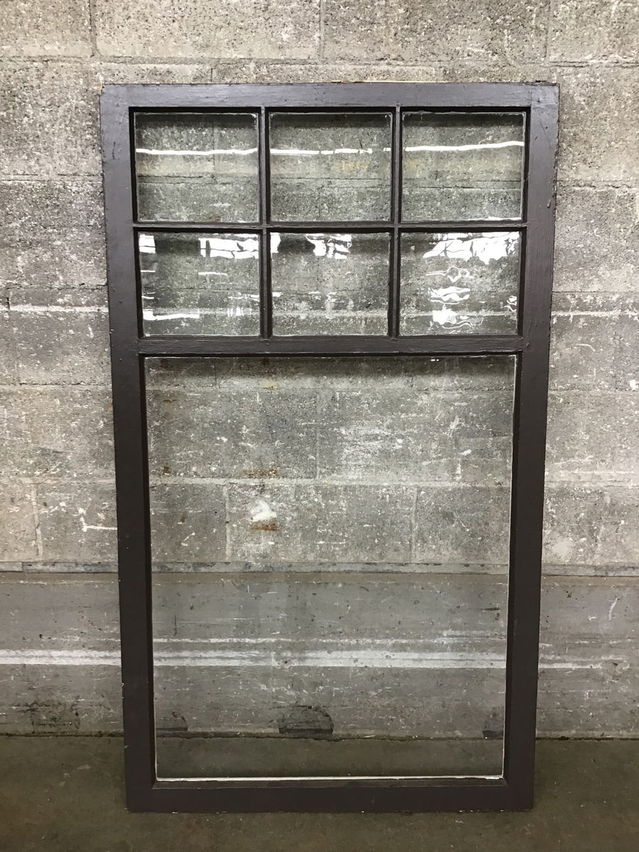 Very handsome single pane wood window sash with one large pane and 6 smalls up top. Has concealed casement arms on one side. Good construction, frame is in nice shape. Has been painted brown on one side and white on the other.