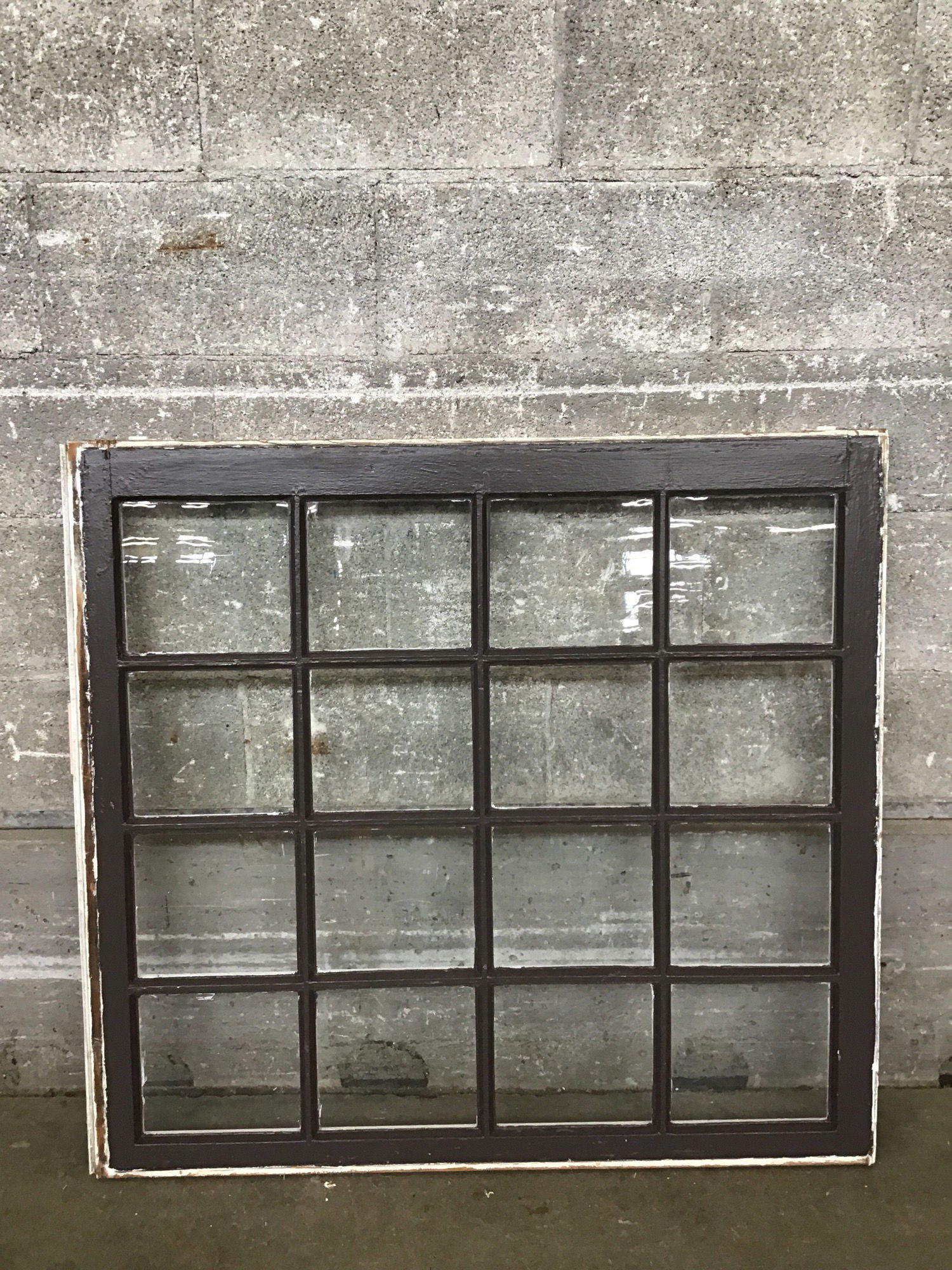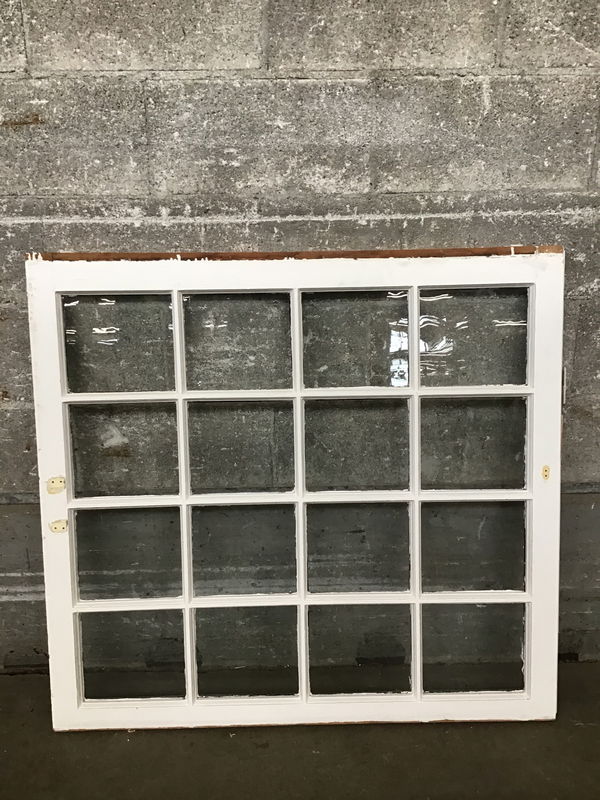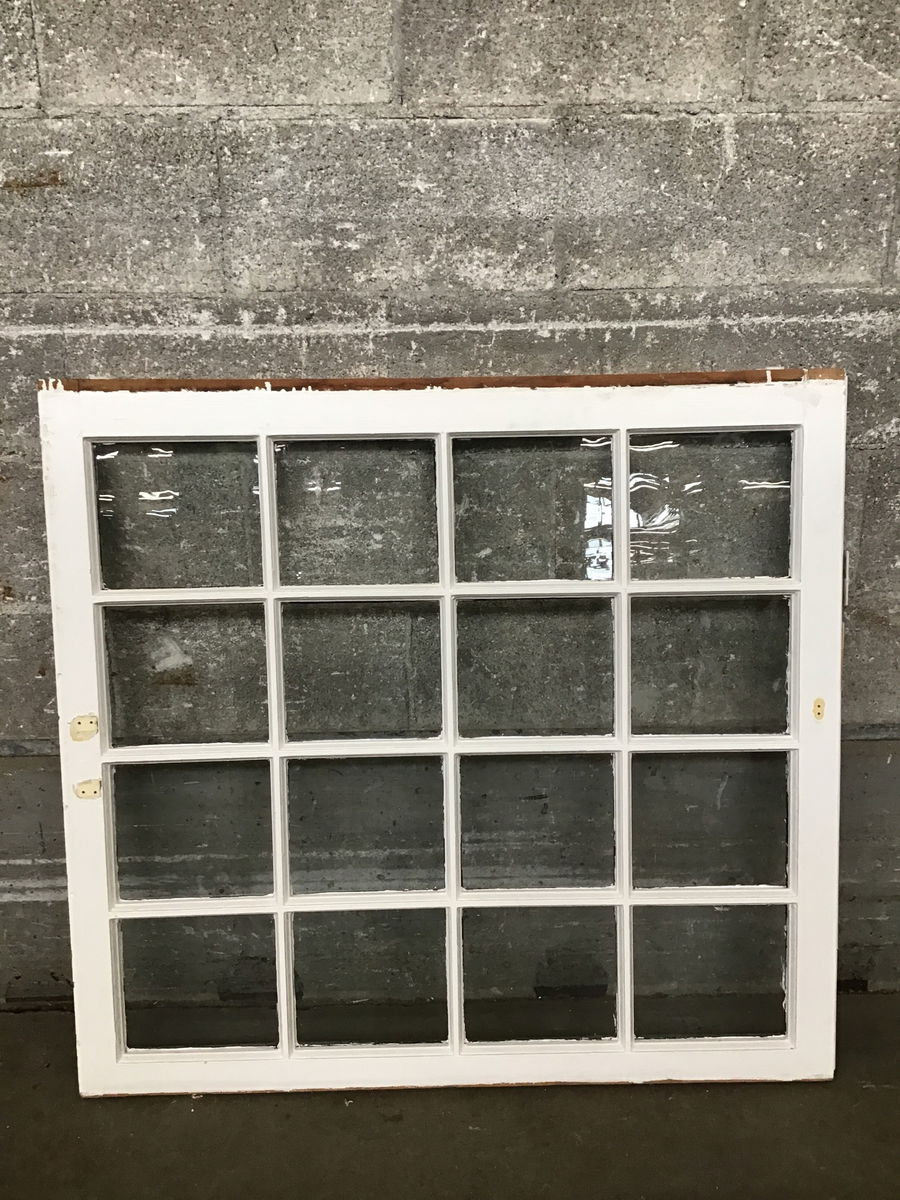 Very handsome wood window sash with 16 wavy glass small lites. Seems like it was previously installed on pegs rather than hinges to allow it to swing out and open. One is cracked, price reflects. Painted brown on one side and white on the other. Good construction, frame is in nice shape.