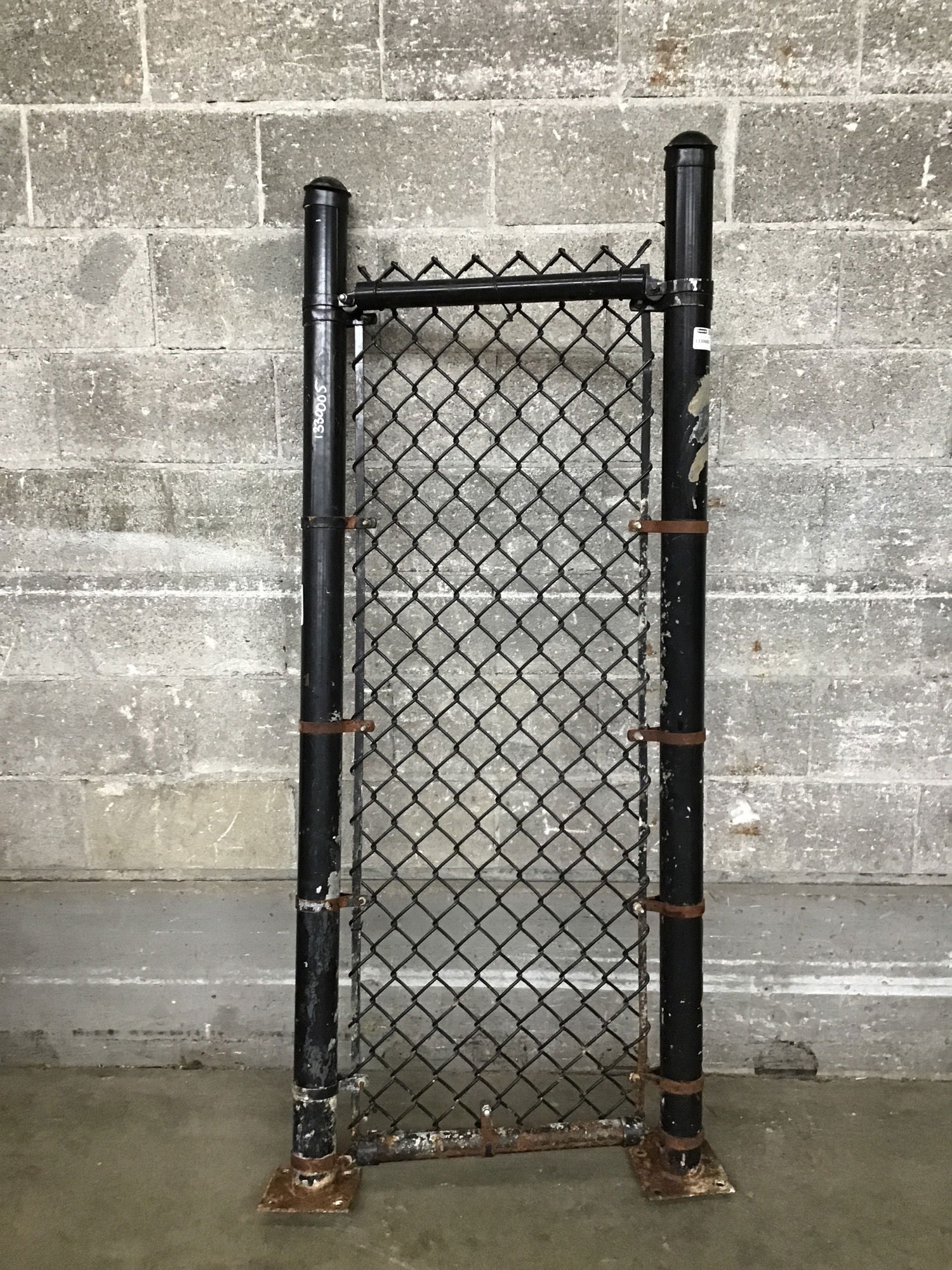 Approx. 29in wide panel with 3in diameter posts, about 67in tall in black. Has bases for bolting to the ground.