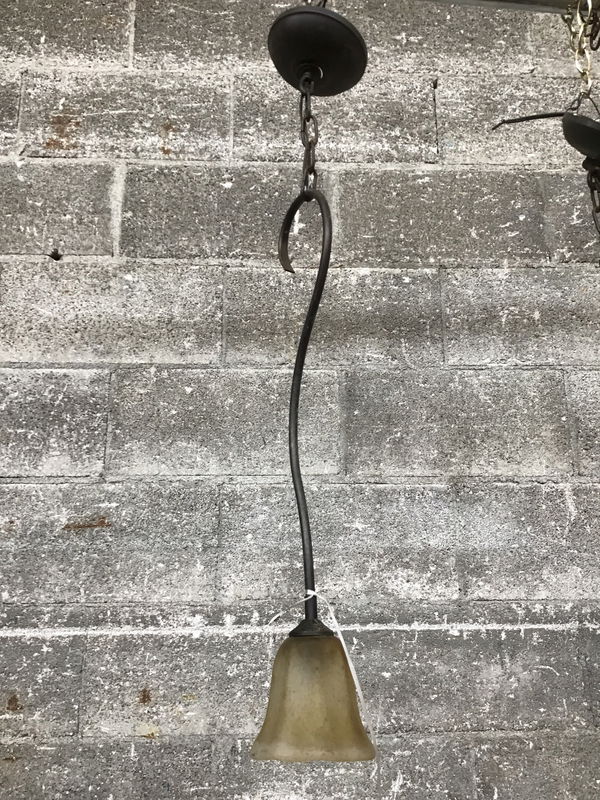 Small H.A. Framburg pendant light that looks like a flower flipped upside down. Some light rust on the chain. Suitable for dry locations only.