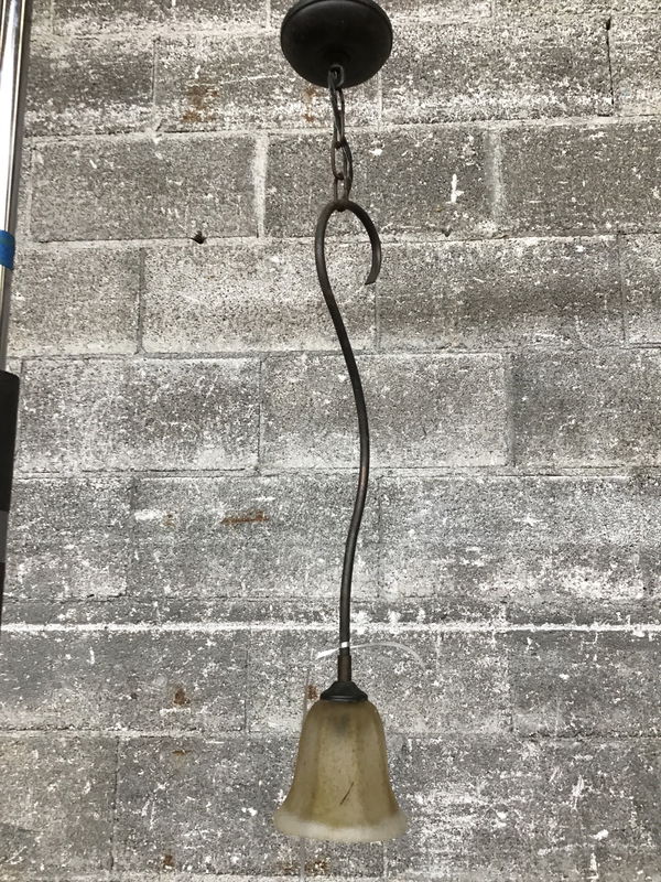 Small H.A. Framburg pendant light that looks like a flower flipped upside down. Some light rust on the chain. Suitable for dry locations only.