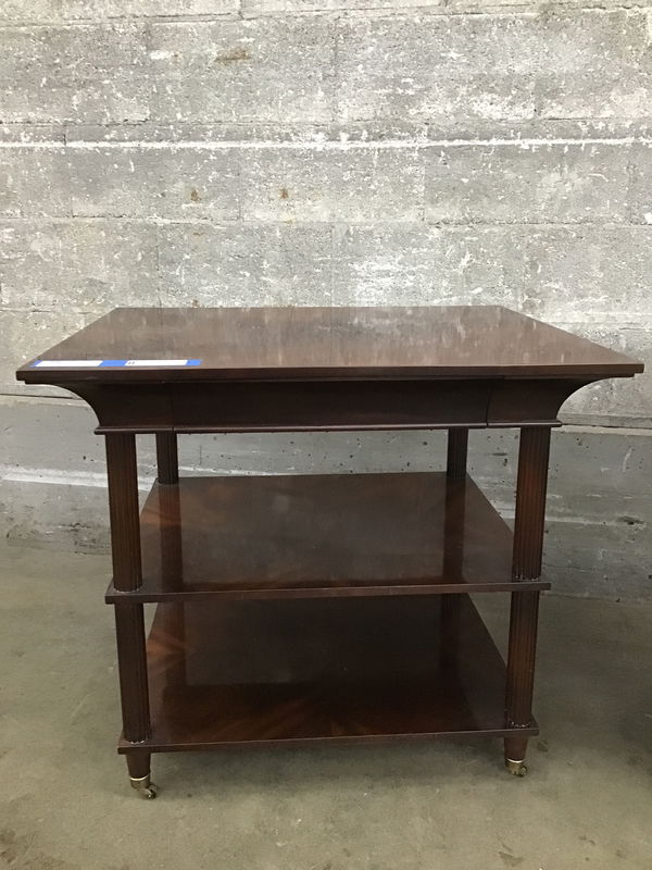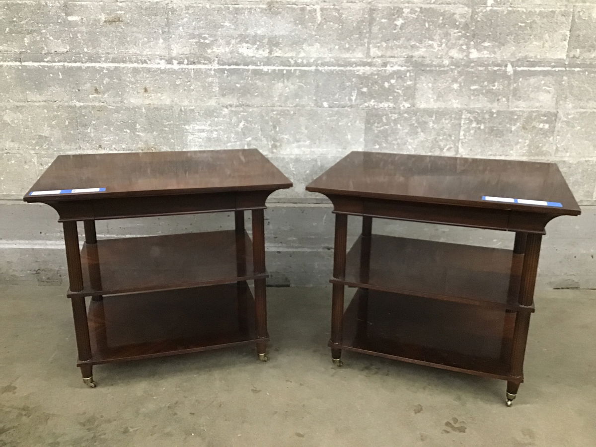 A pair of nightstands or side tables by Thomas Pheasant for Baker Furniture. These tables have a refined style, blending elements of Federal and Regency periods for a timeless and commanding presence. They feature beautiful figured mahogany veneer tops and columnar legs tapering to elegant brass caps and casters, and with a second tier shelf as well as hidden drawers, there's plenty of space to keep your things organized! We're estimating them to be circa 2000 or later by the original factory sticker on the underside. There's some cosmetic wear on top and a broken leg that needs work. Comparable tables from Baker Furniture's current catalog retail for upwards of $2000 each.