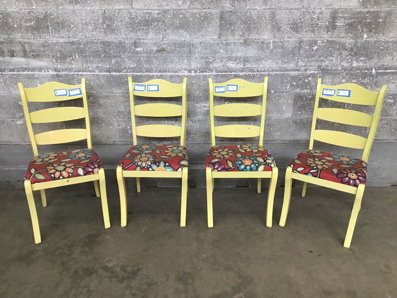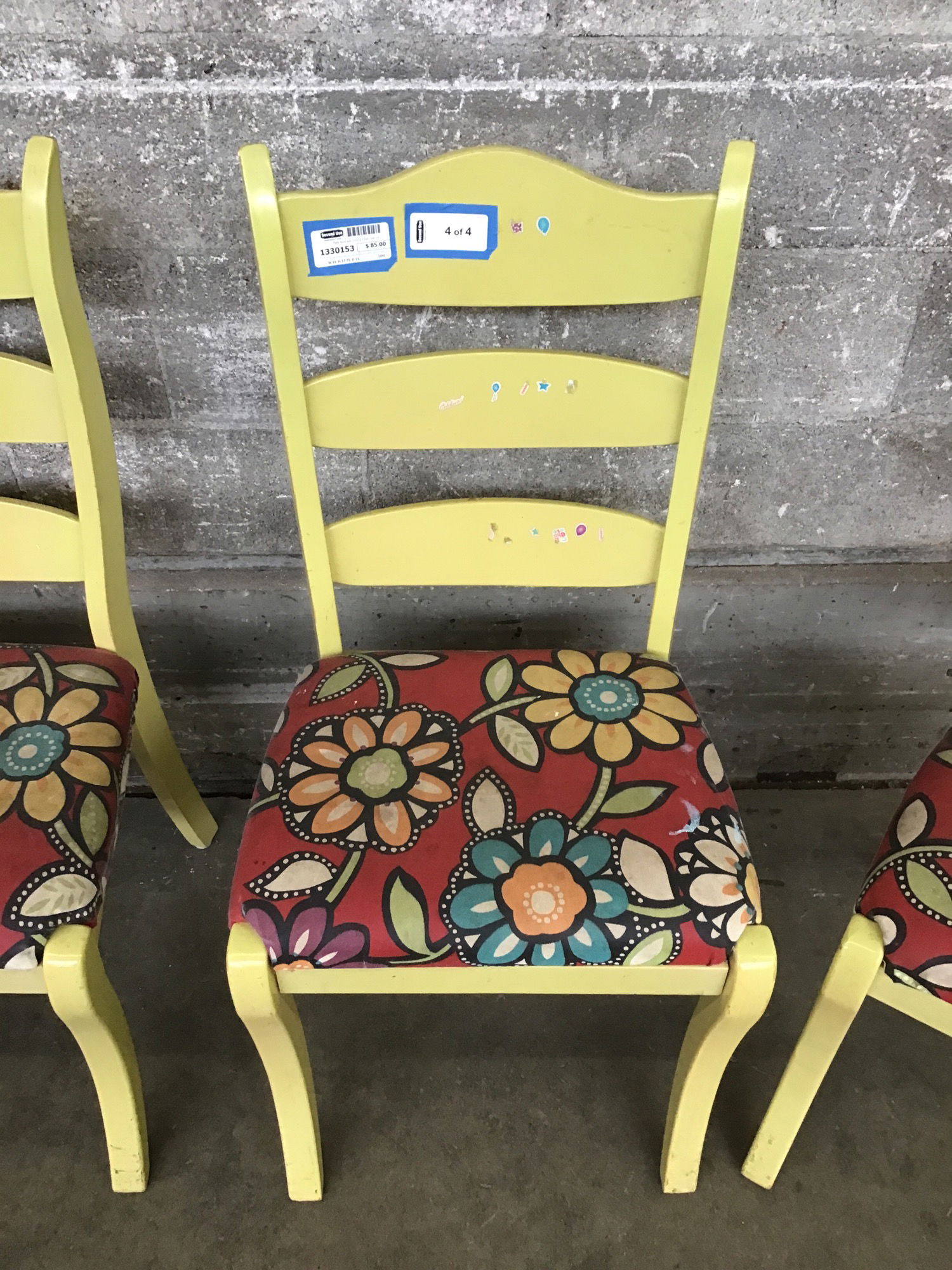 This set of four dining chairs feature a solid wood frame, a pale avocado green painted finish and soft upholstered red seat cushion with multicolor floral motifs. This dining chair set would look great in a sunny home that appreciates plants.