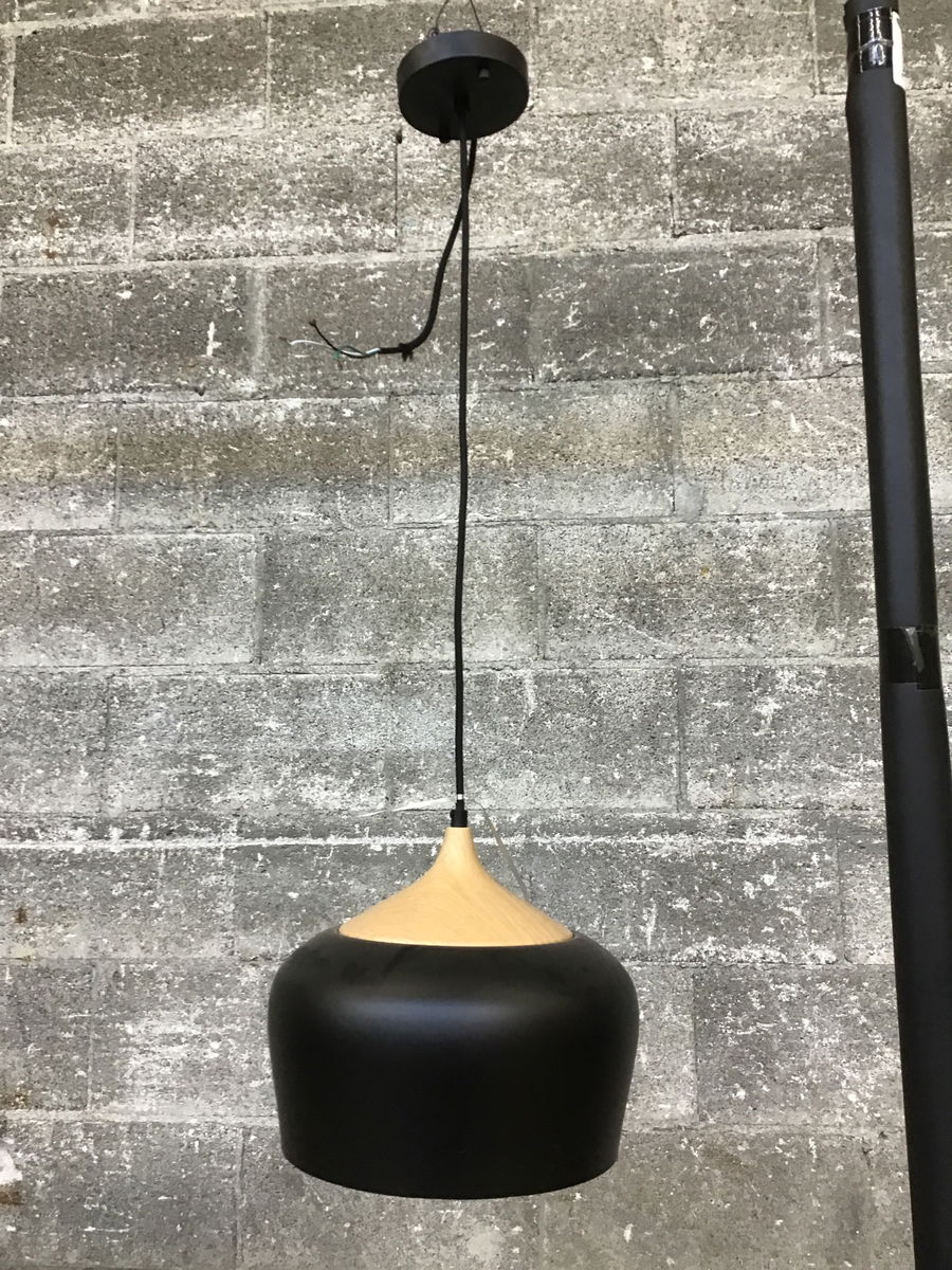 Modern Pendant Light with a sort of Scandinavian farmhouse look. Nice matte black finish with a faux wood grain fitter.