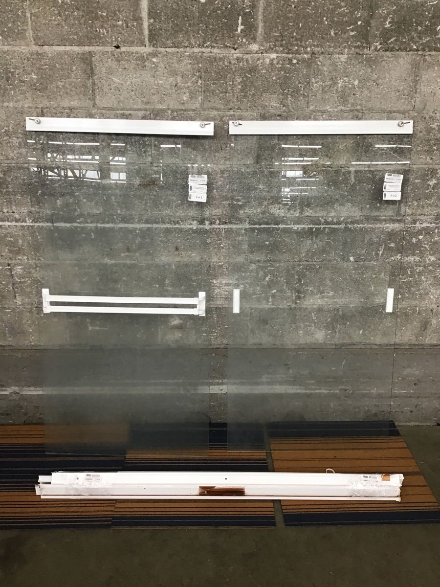 A pair of frameless bypass shower doors with matte white hardware. Comes with roller track and trim.