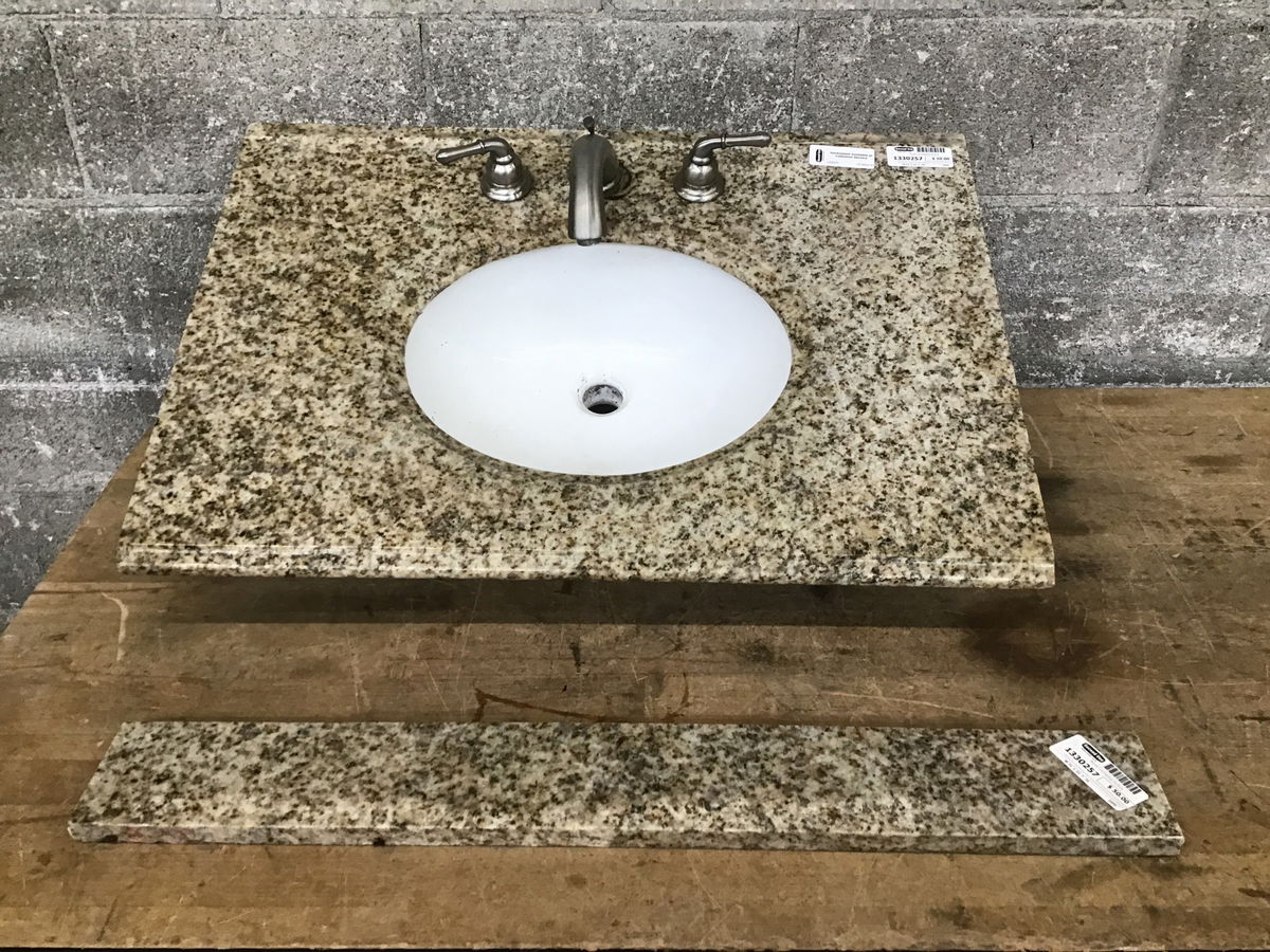 Granite lav countertop with attached undermount sink and simple nickel faucet. Will need a new drain assembly. Includes matching stone backsplash.