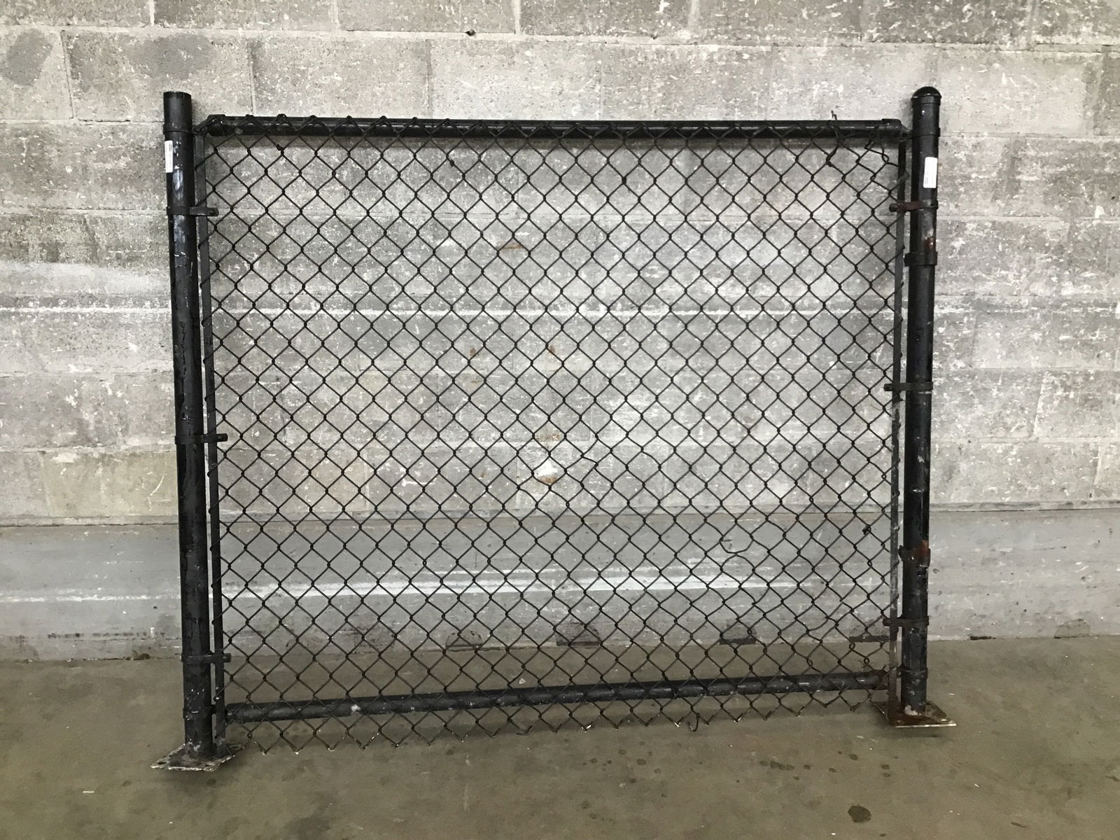 Heavy duty chain link fencing with two posts with mounting plates. Painted a matte black with a black rubber coating on the chain links. Photo may be representational.