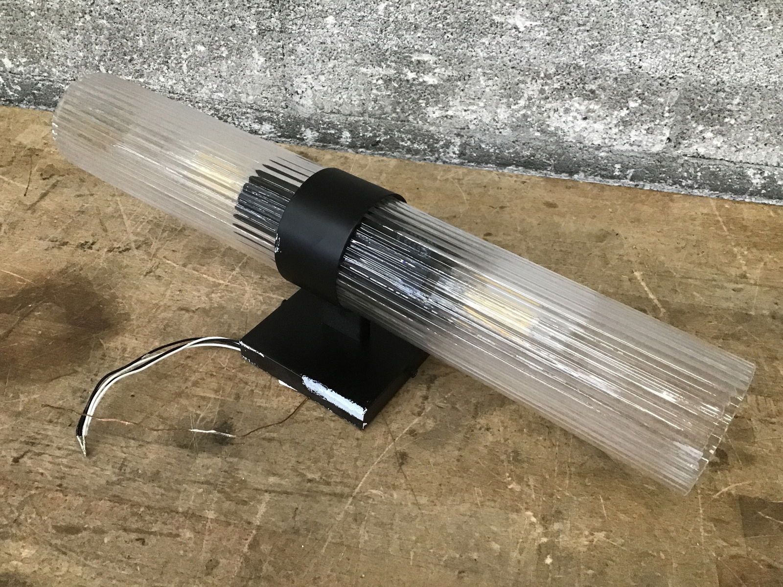 Wall sconce with ribbed glass shades that's suitable for damp locations.