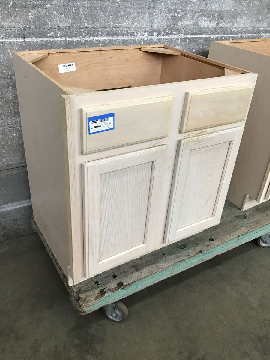 Recessed panel oak vanity sink base with a white wash stained finish.