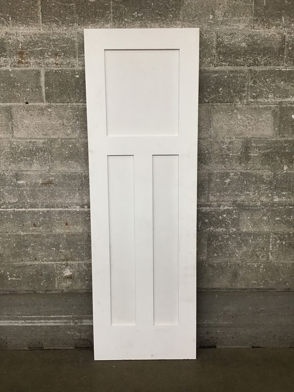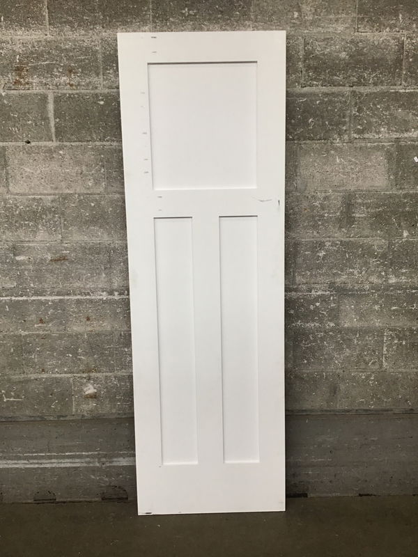 Undrilled, primed masonite, Craftsman style three panel door. Item may have cosmetic damage.