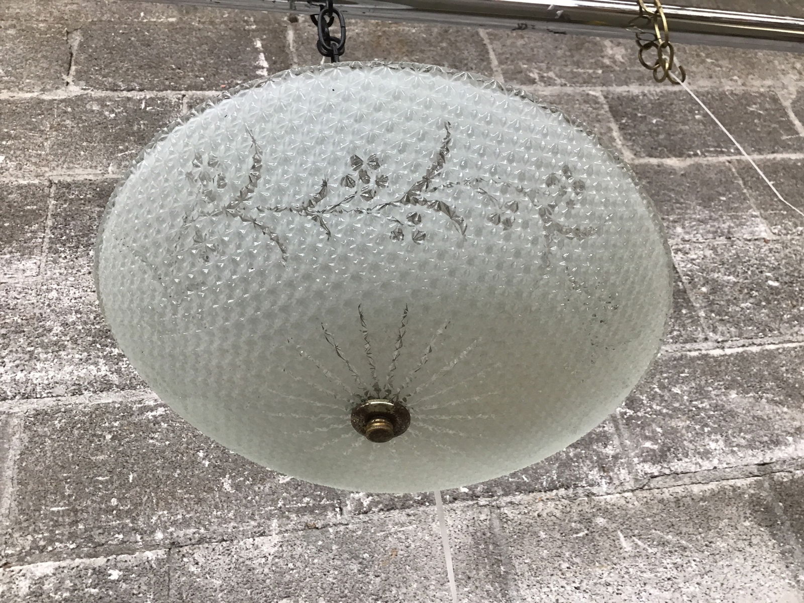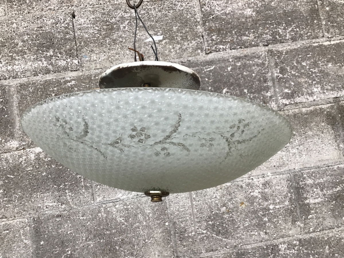 Classic mid-century ceiling mount light fixture with a decent, textured shade and a fitter that needs some TLC or replacing.