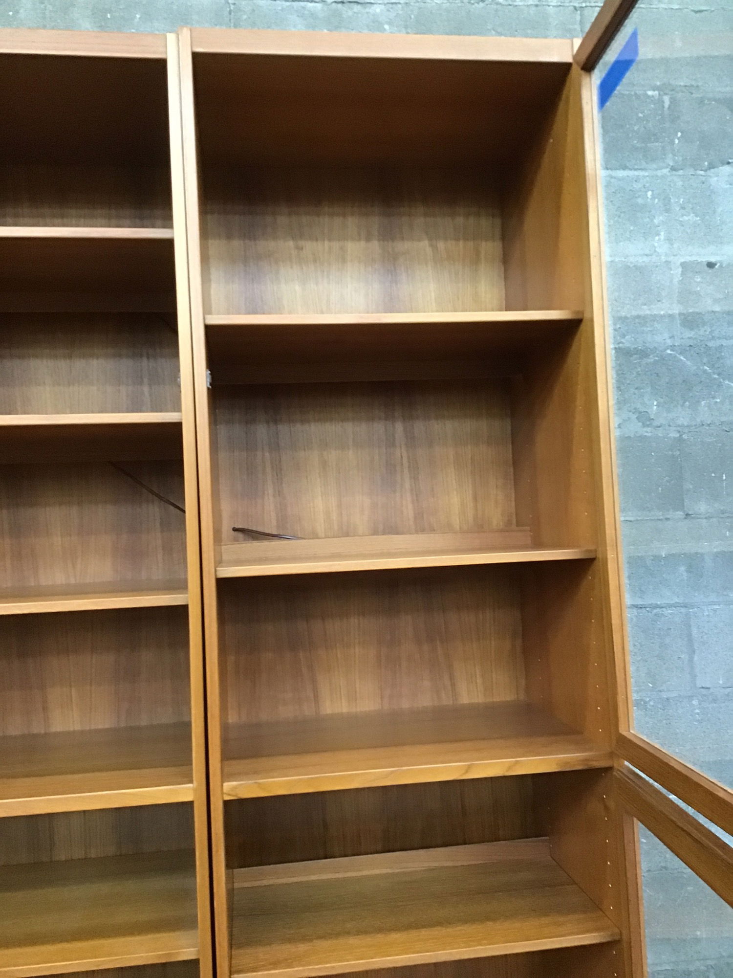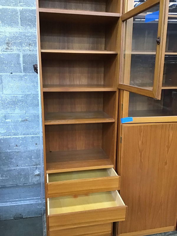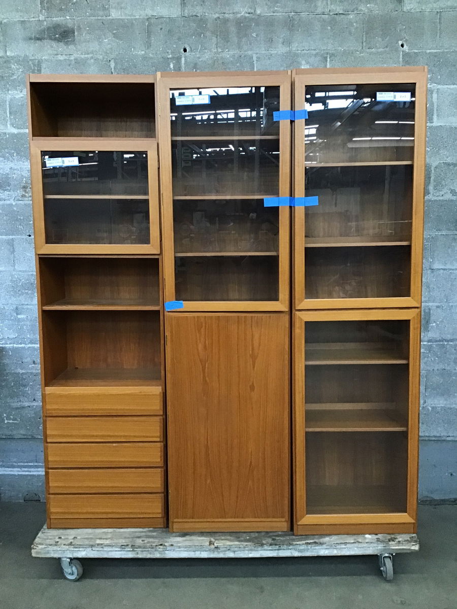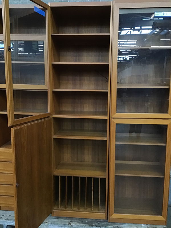 Three piece teak cabinet system that was made by Scan-Flex and in Denmark. Each cabinet is the size listed and has at least on light built into the back. From what I found online, Scan-Flex Furniture operated from the 1950's-70's with much of the design work done by William Watting & Omman Jun Mobelfabrik. It's a gorgeous looking set with slots for record storage behind the wood door of the center cabinet.