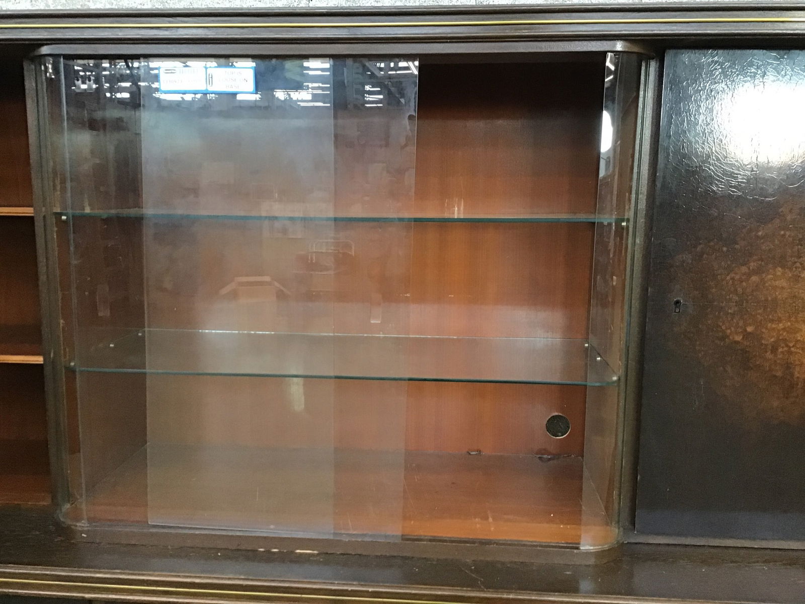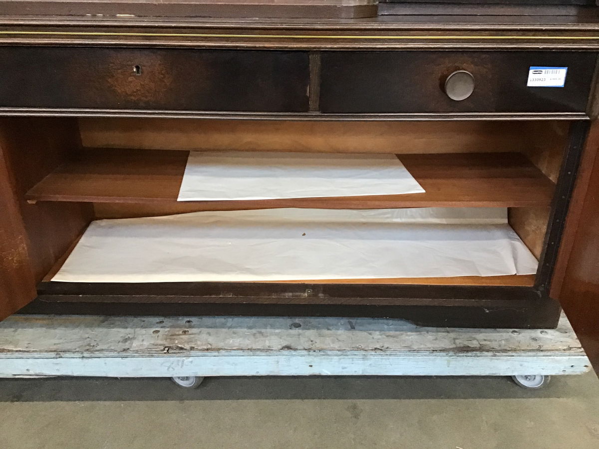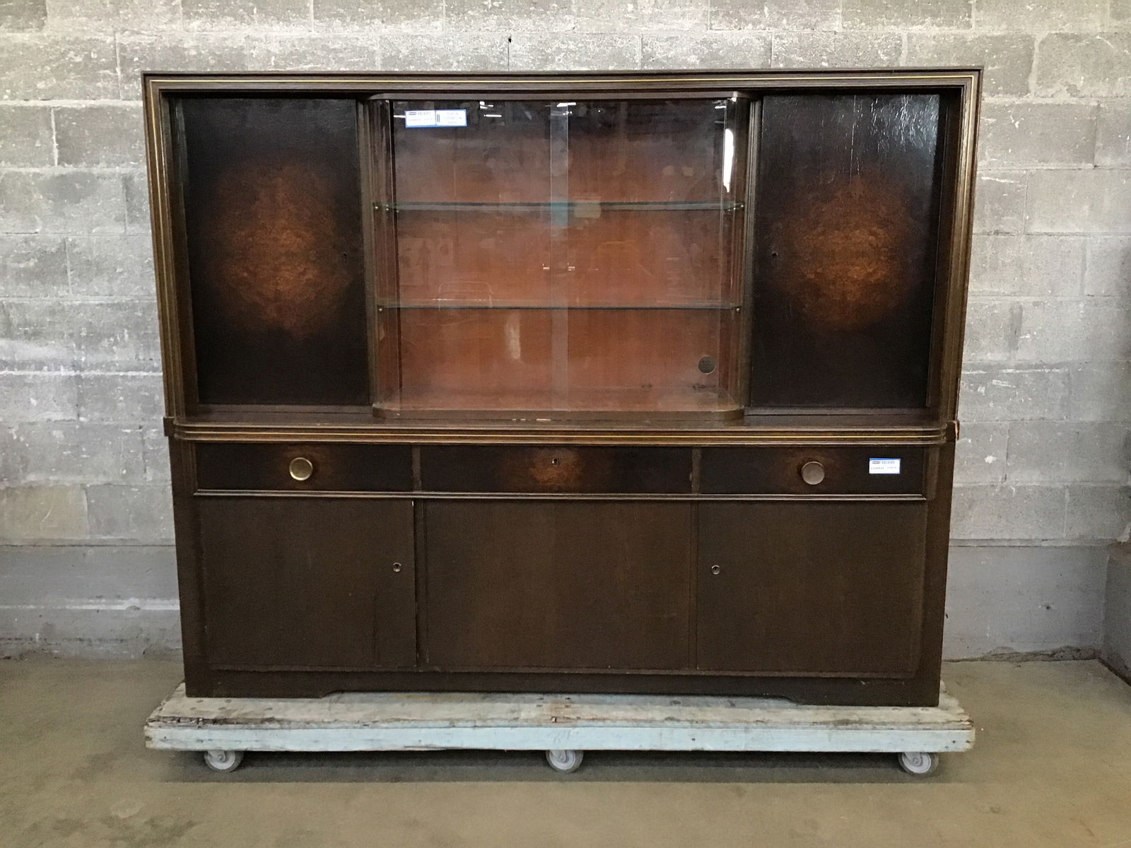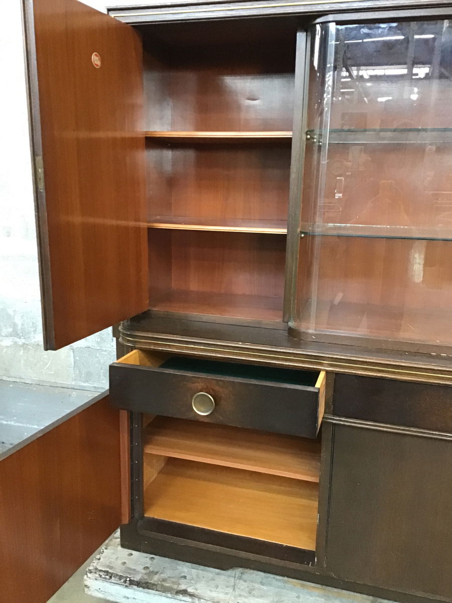 Streamline vibe buffet that looks to have been made in the Oerlinghausen-Lippe area of Germany by a Musterring Mobel (tag is on the inside of the left top door) in ?1951? from the tag on the back of the top, which is resting on the base and can be removed for transport. The main body looks to be oak, but I'm not sure what the dark stained door and drawer faces are. It looks a little like pillowed maple veneers. There are glass shelves behind the bypass style glass doors.