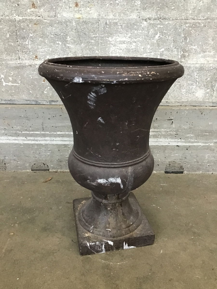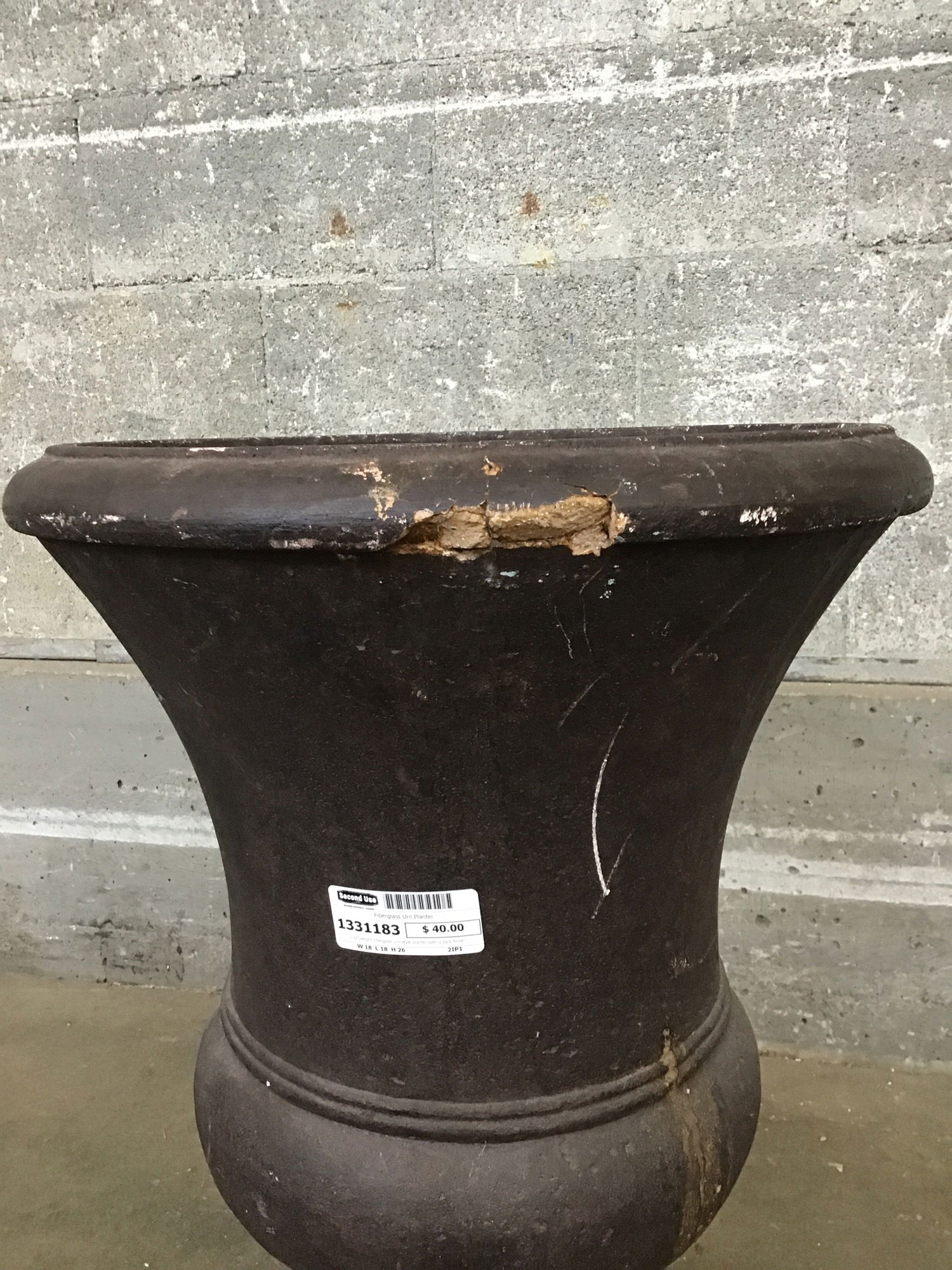 Lightweight fiberglass urn-style planter with a dark finish. Has a crack on the lip on one side, price reflects.