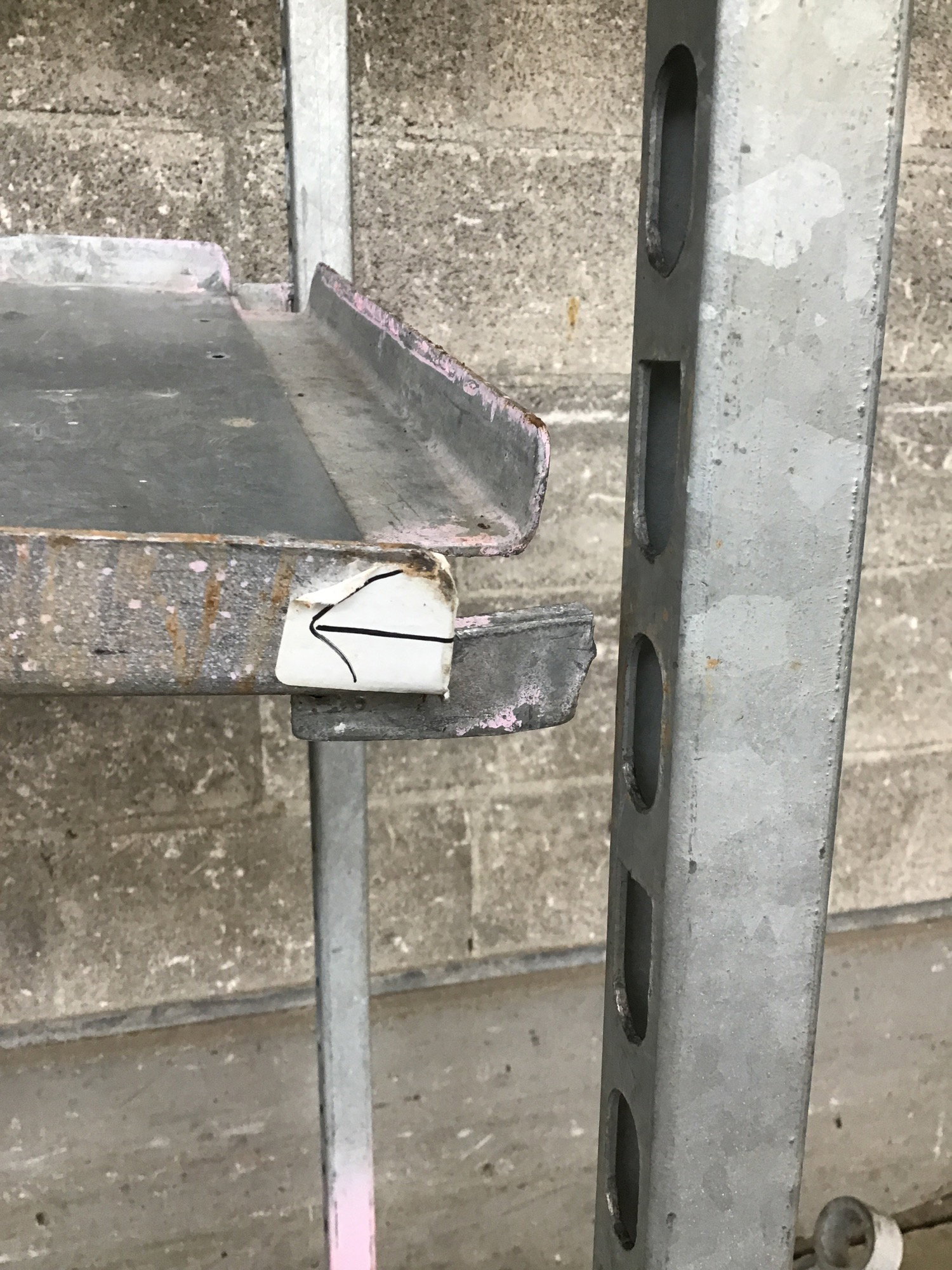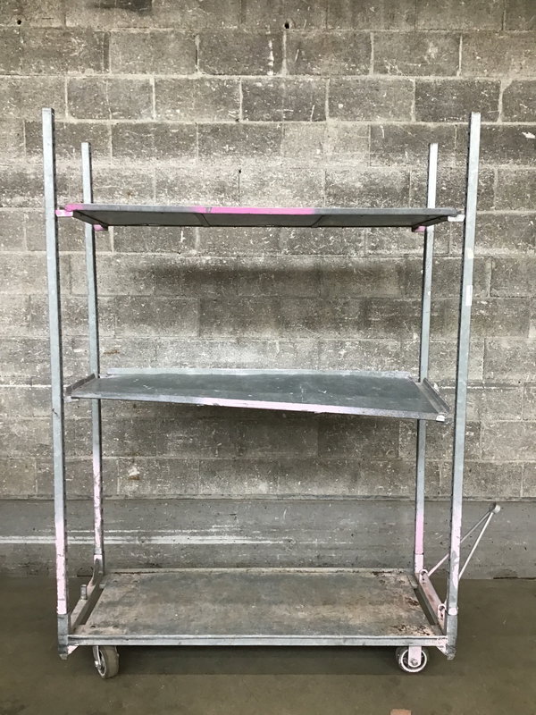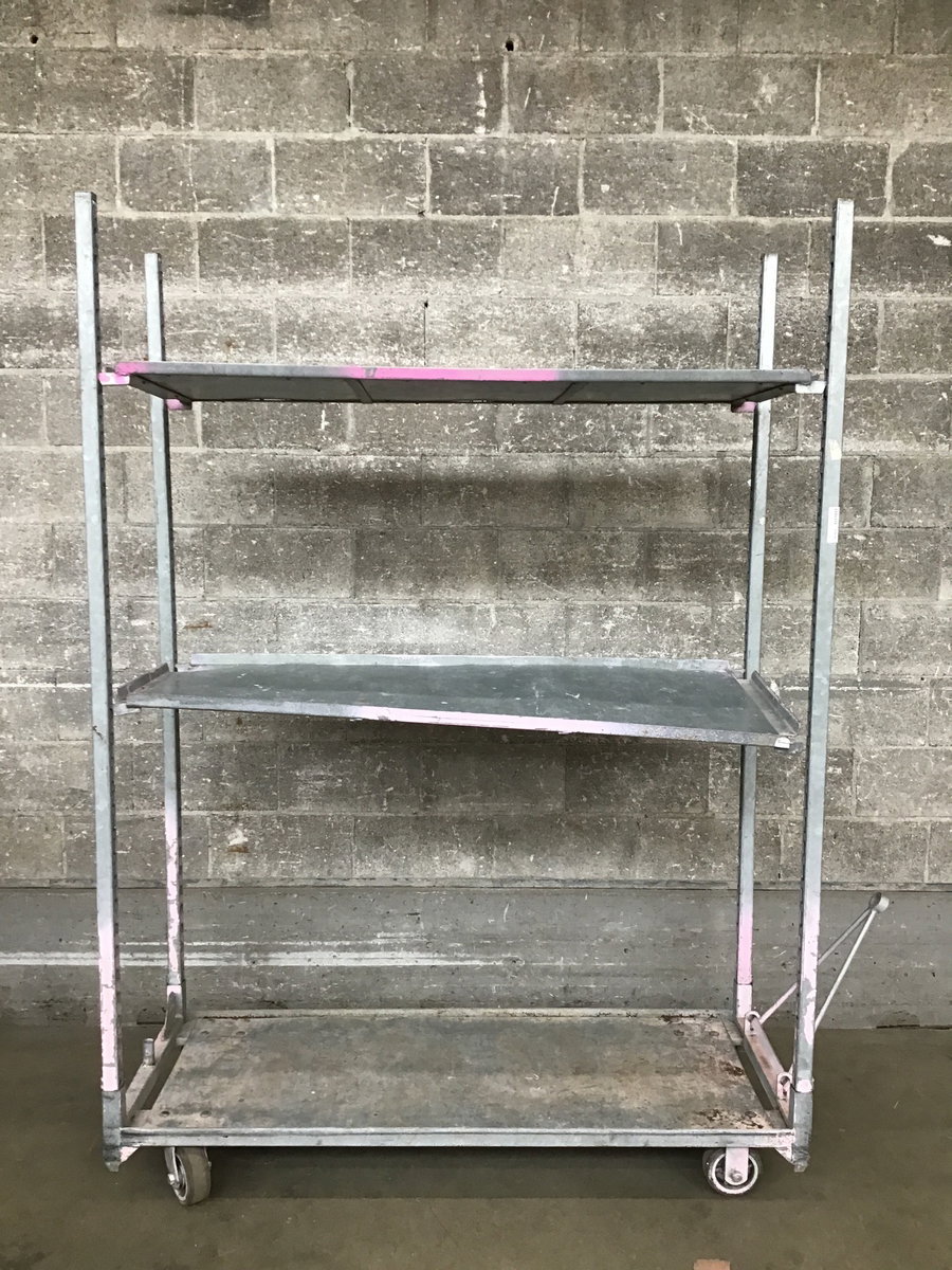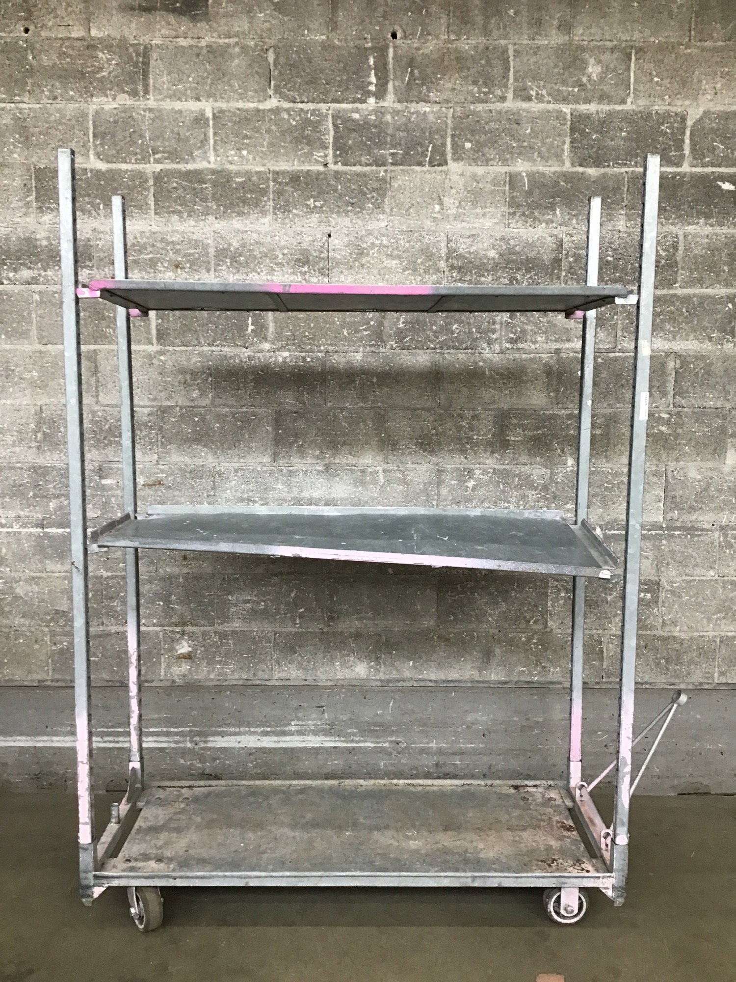 Rolling steel rack with two adjustable shelves and a handle on one end. A hook on one shelf has broken, so it currently has a bit of a lean to it. You could try repairing it or just replace the shelf with plywood and your own shelf pin system.