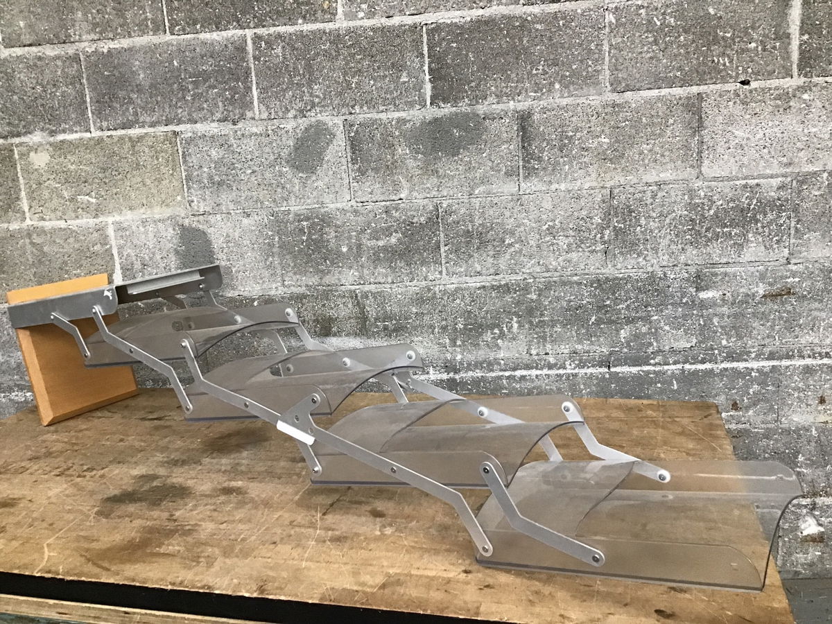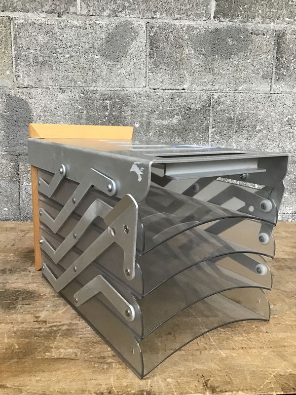 Little organizer guy with four plastic pockets and wood base that expands out to 28" with the metal braces on each side. Seems heavy duty.