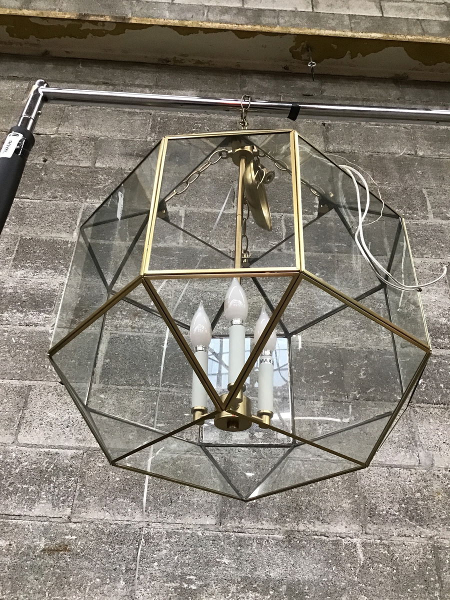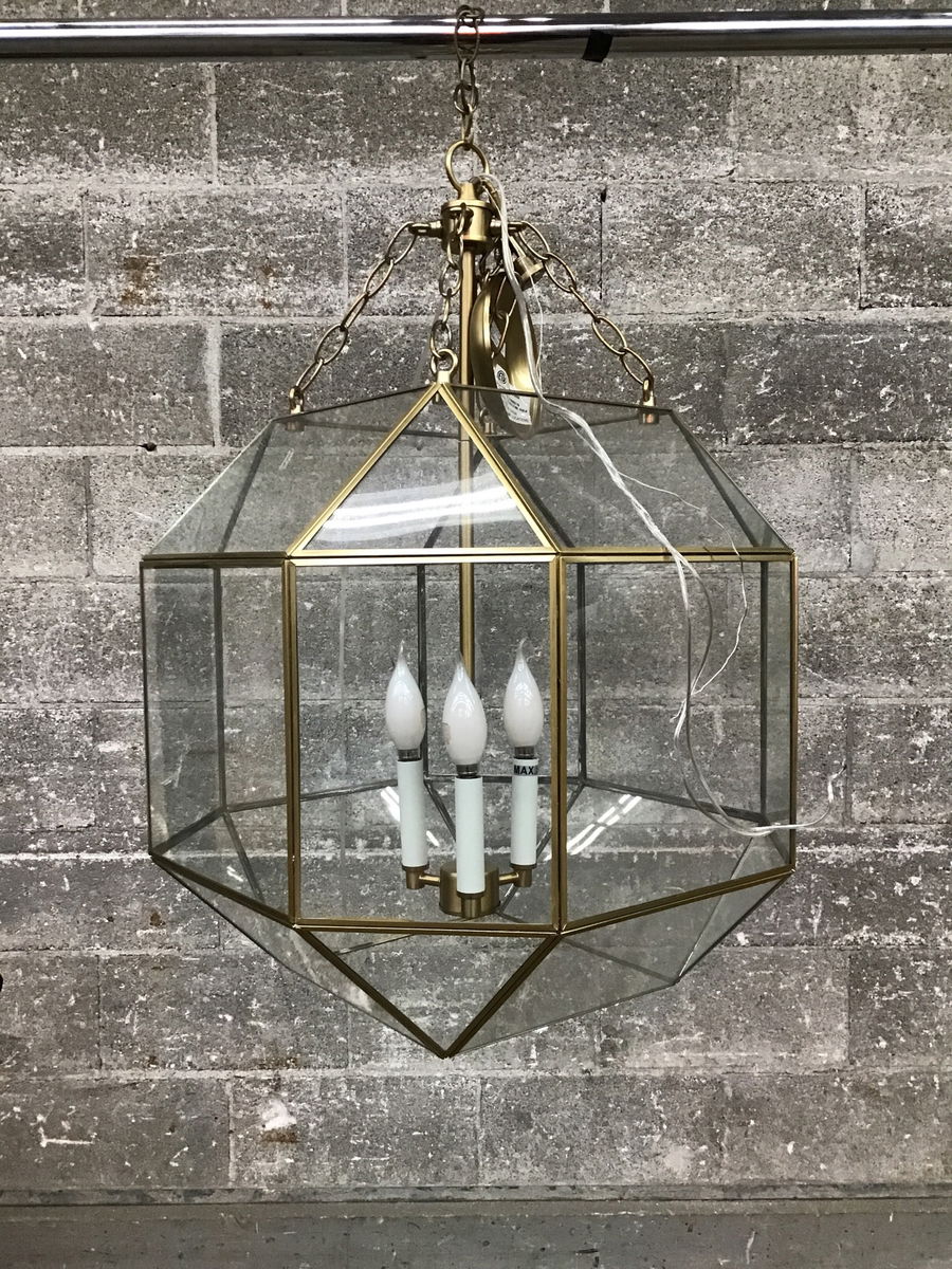 Visual Comfort "Morrison" light comprised of clear glass panes set in a brass frame. Takes three candelabra bulbs. Compatible with sloped ceilings as the section that holds the bulbs moves freely from the shade. Retails new for $479