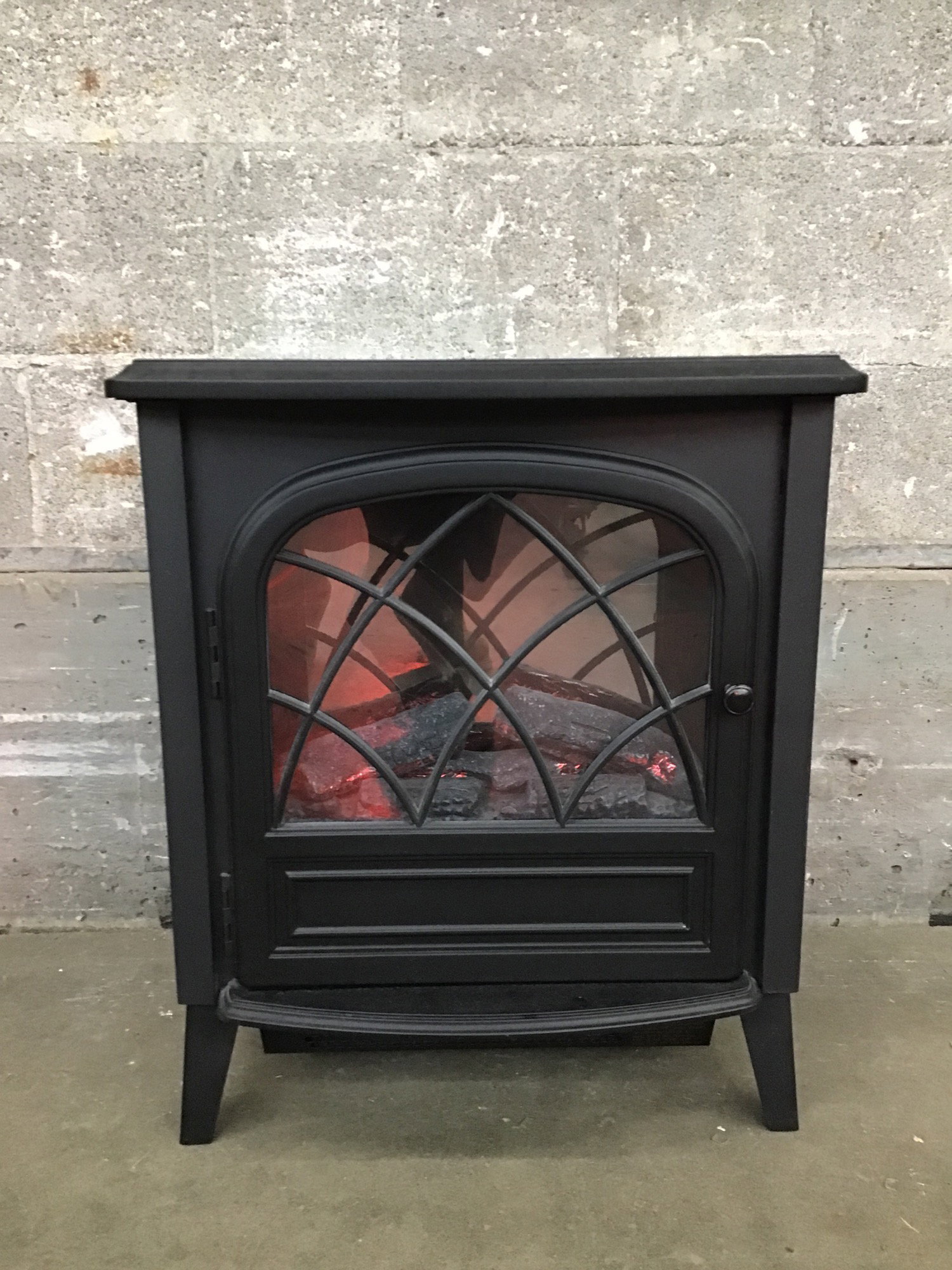 Tiny, freestanding electric fireplace that has a pretty realistic glow and kicks out heat from below. This appeared to be working like a dream when tested in house. Would be awesome for creating a cozy place to curl up with your friends or sweetie(s) in a small apartment!