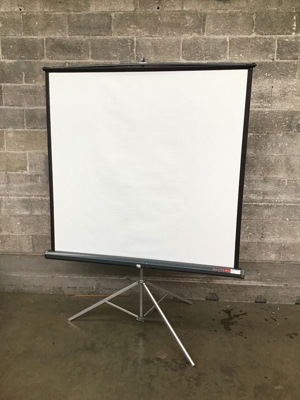 A vintage Da-Lite Vidio screen projector. Screen size is about 60"x60" and stands around 8.5' in height. The screen itself is solid white and looks to have no scuffs, scratches or any cosmetic issues to note.