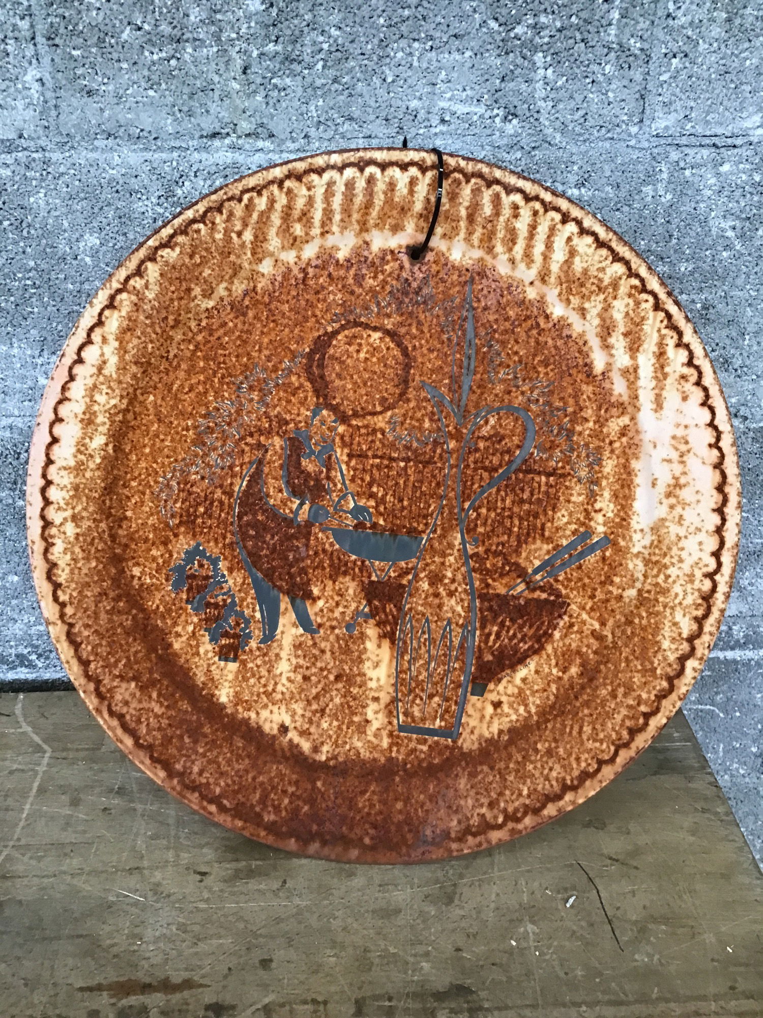 This tastefully patina'd steel platter features a very content looking chef surrounded by contrasting green cooking accoutrements. Hang it on your fence or by your outdoor kitchen!