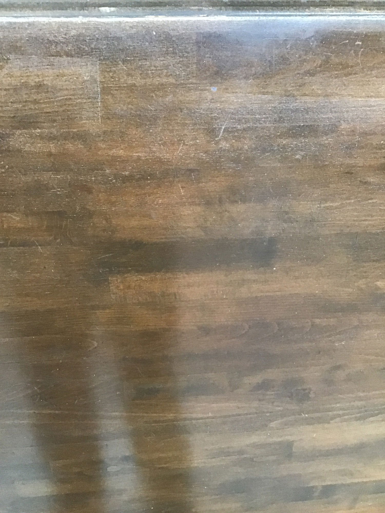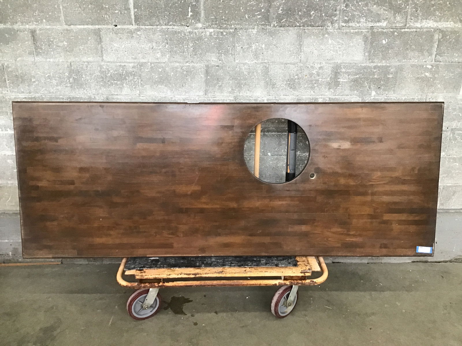 8x3ft maple butcher block counter with ogee edge, stained a chocolatey brown. Has a round sink cutout about 15in in diameter.