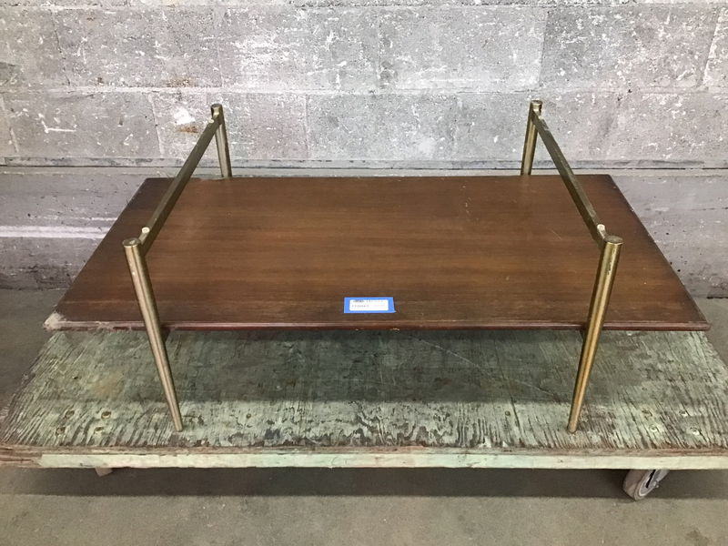 This is a nice little West Elm coffee table with a mahogany top which had a glass top at one point, but did not come to us with it. It's not a weird size at all, so you could get a new glass top, but it's also wood month! You could find a nice piece of wood to make a second top!