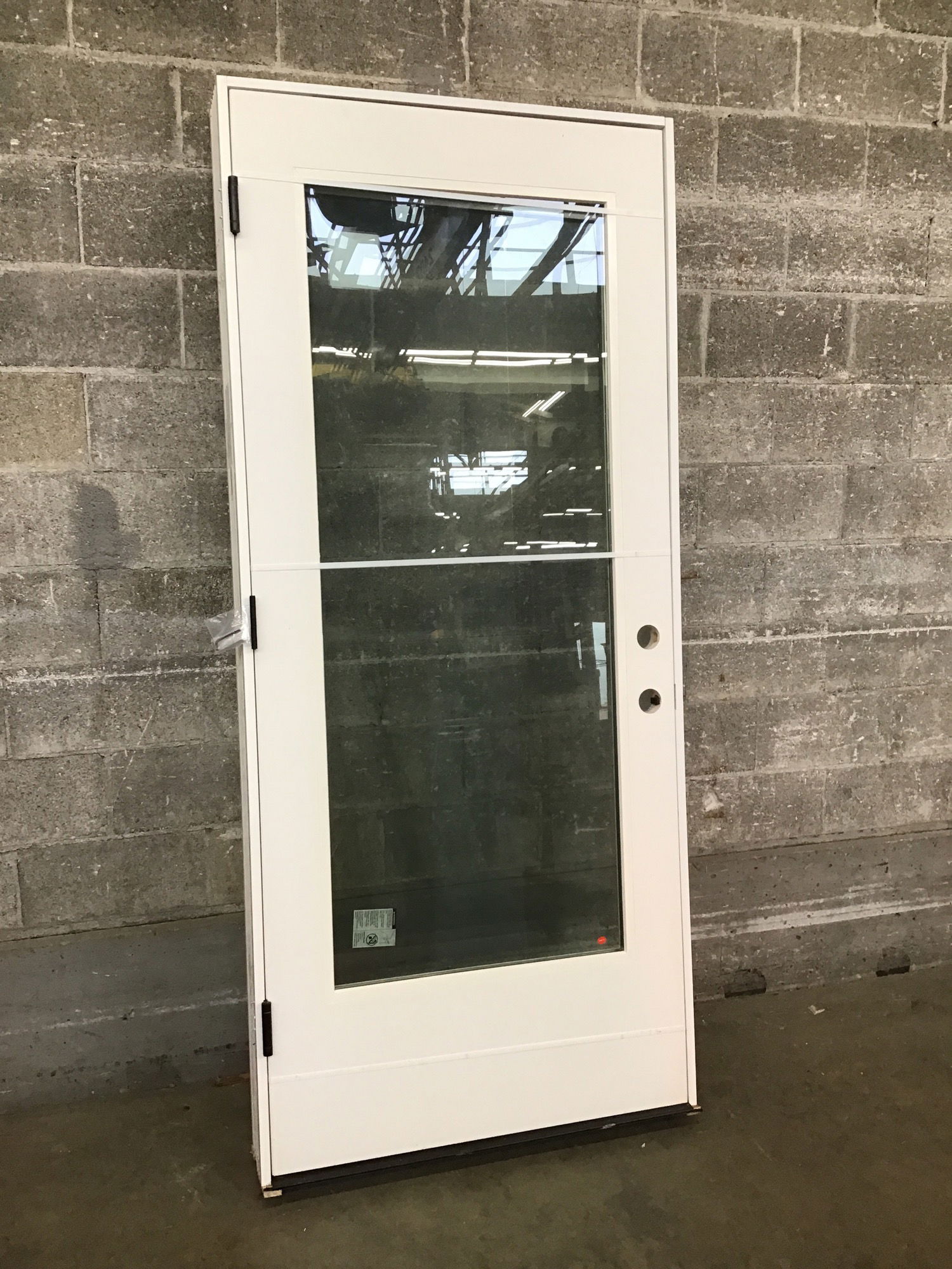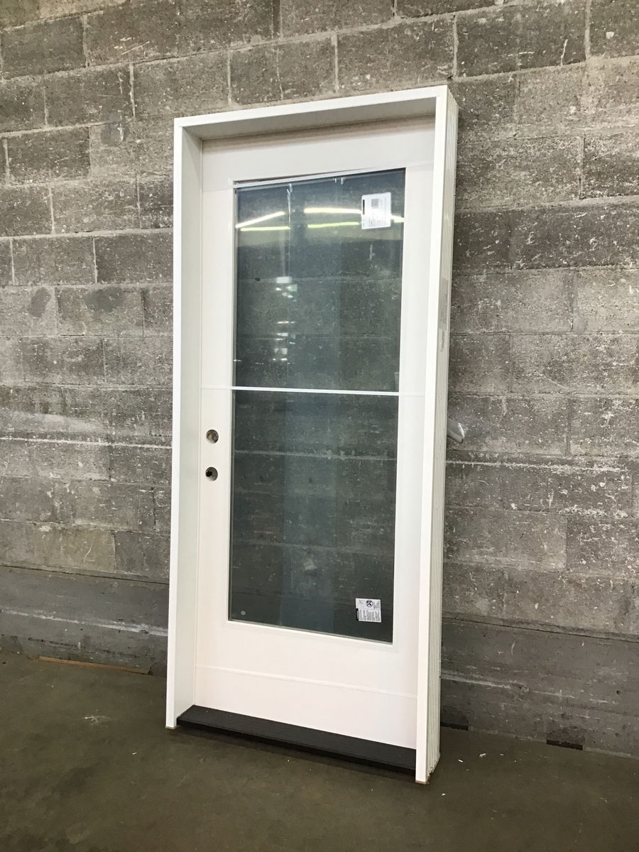 Never installed full lite entry door with in excellent condition having arrived to us with it's finish protecting packaging still attached. This outswing door features an extra wide jamb, fire rating, and self closing hinges.