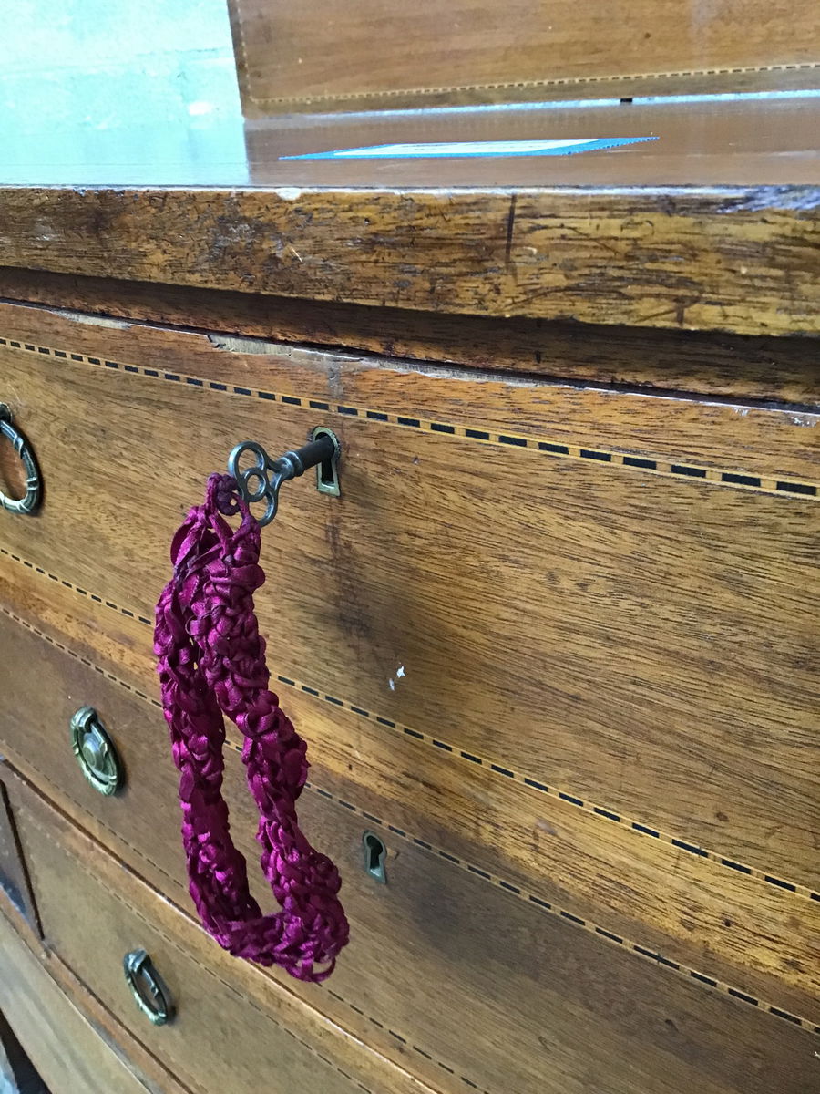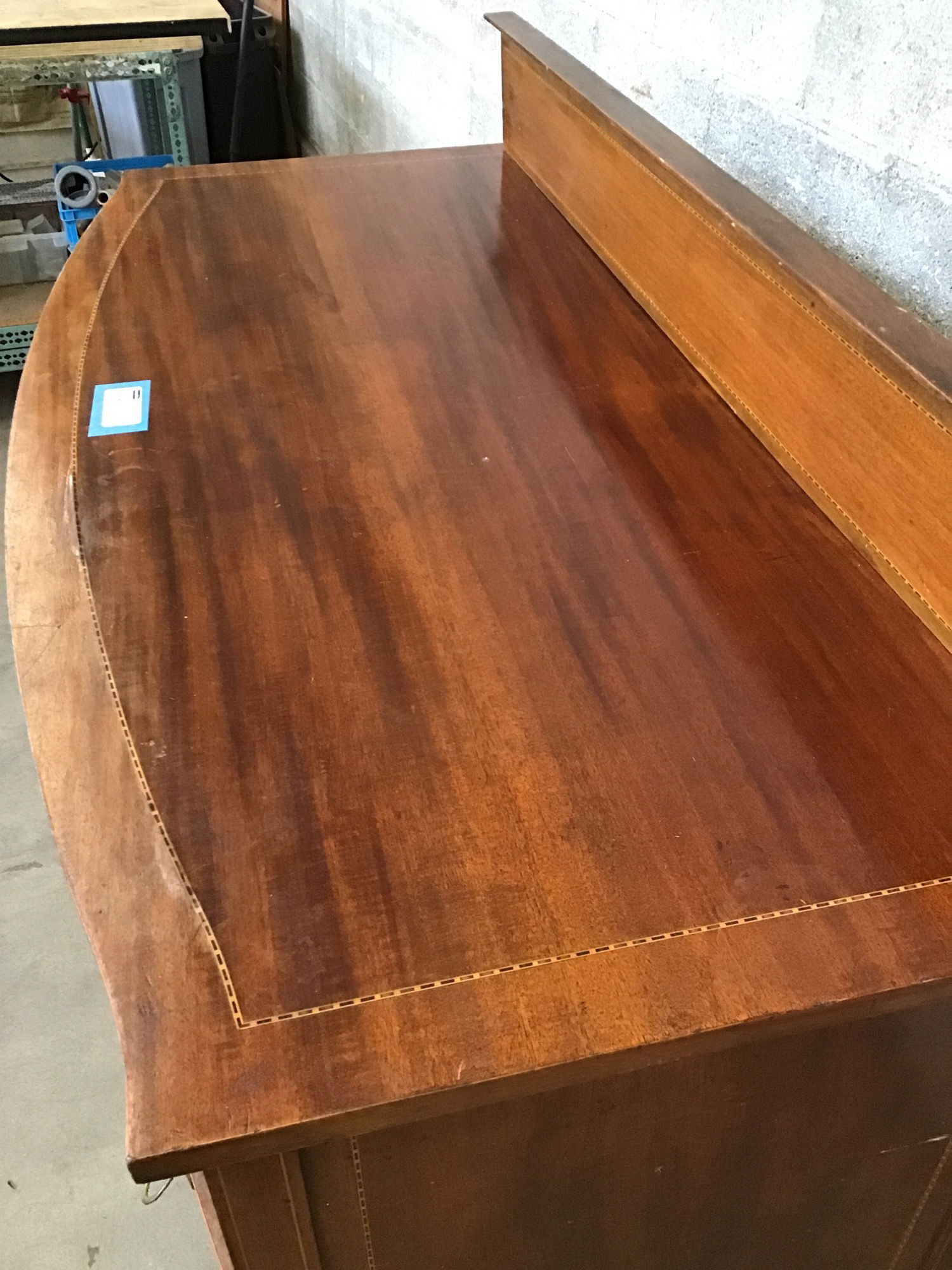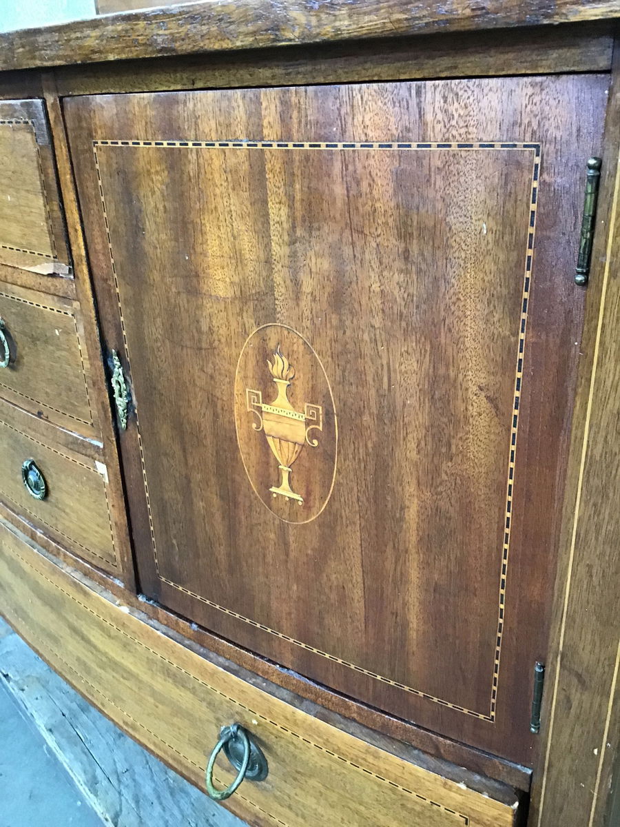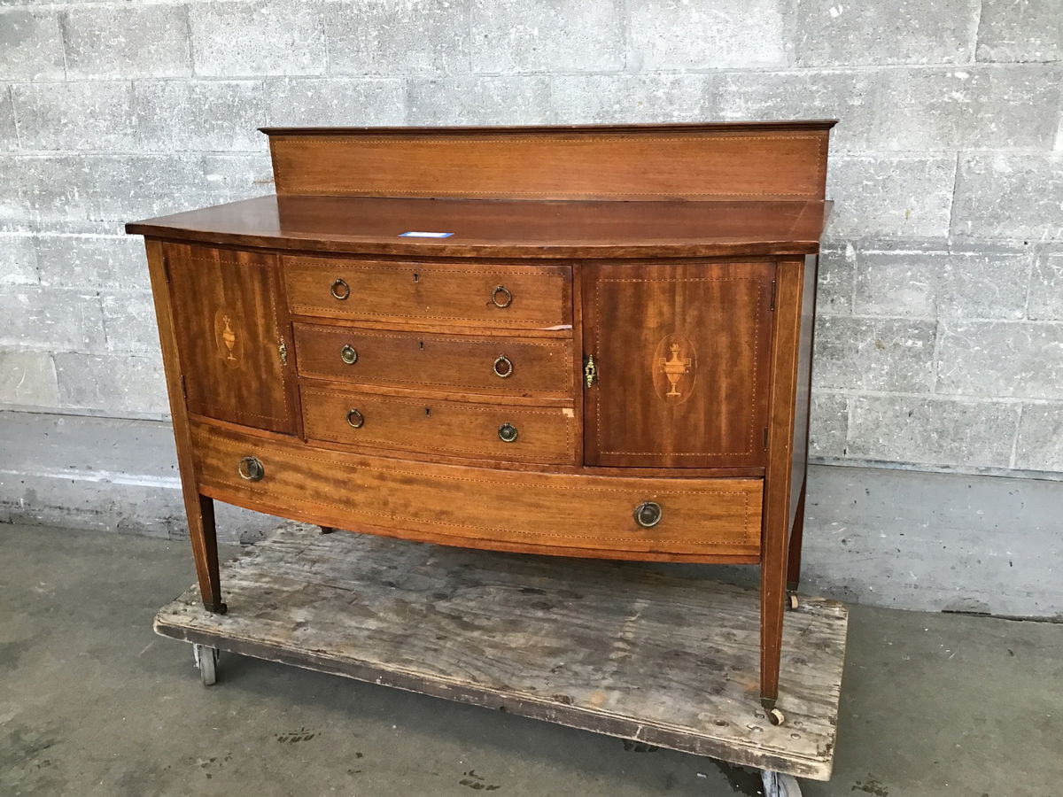 This is a beautiful and majestic mahogany buffet with solid wood construction and subtle inlays all around. There are four drawers and two doors that all have locking mortises in them, and lucky for you, it comes with the key AND it works. Has brass ring pull hardware and rolls on wooden casters. Casters will need some love to get them rolling smoothly again.