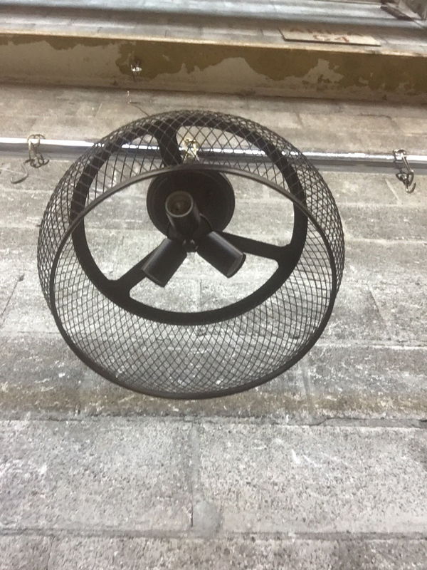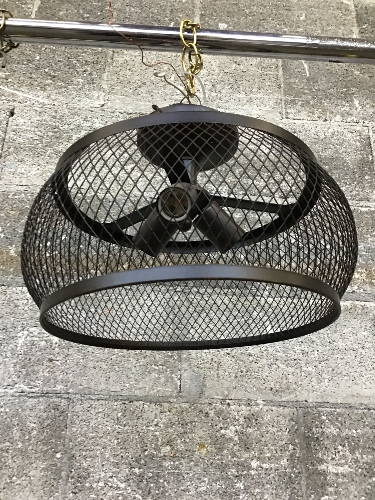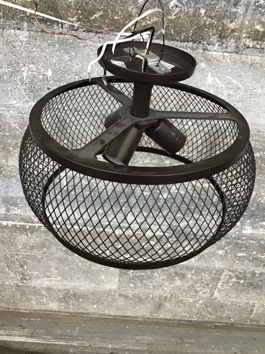 Kichler Model 38175 "Antique Bronze Finish Semi-Flush Mount Light" with a cage style shade. Uses three bulbs. Sells for $54 on amazon.