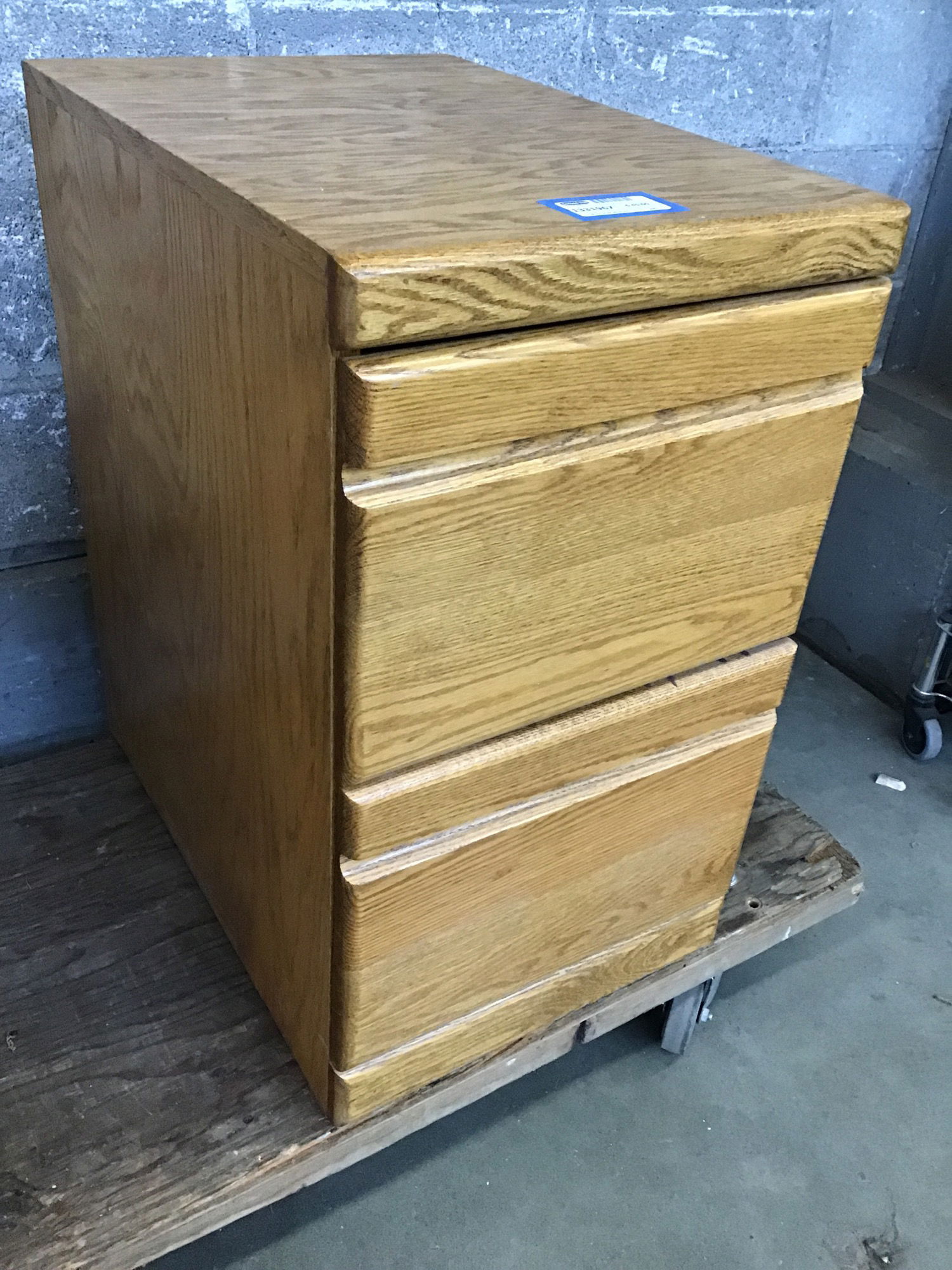This is an older oak file cabinet with two drawers with integrated pulls. Finish is in really good condition.