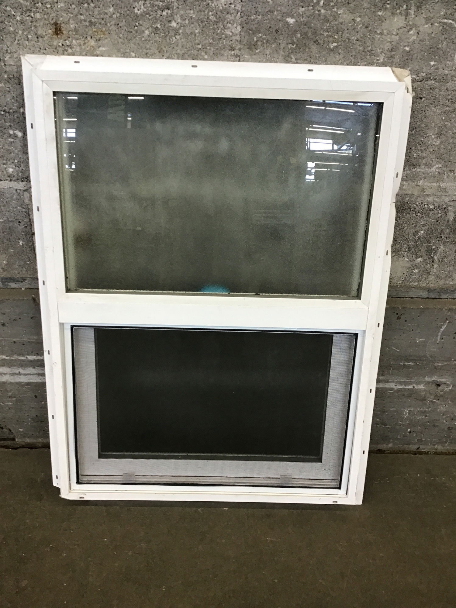 Milgard single hung white vinyl window with nailing fins, screen, thermopane and obscured glass and look to be from 2025. This would make a good bathroom window.