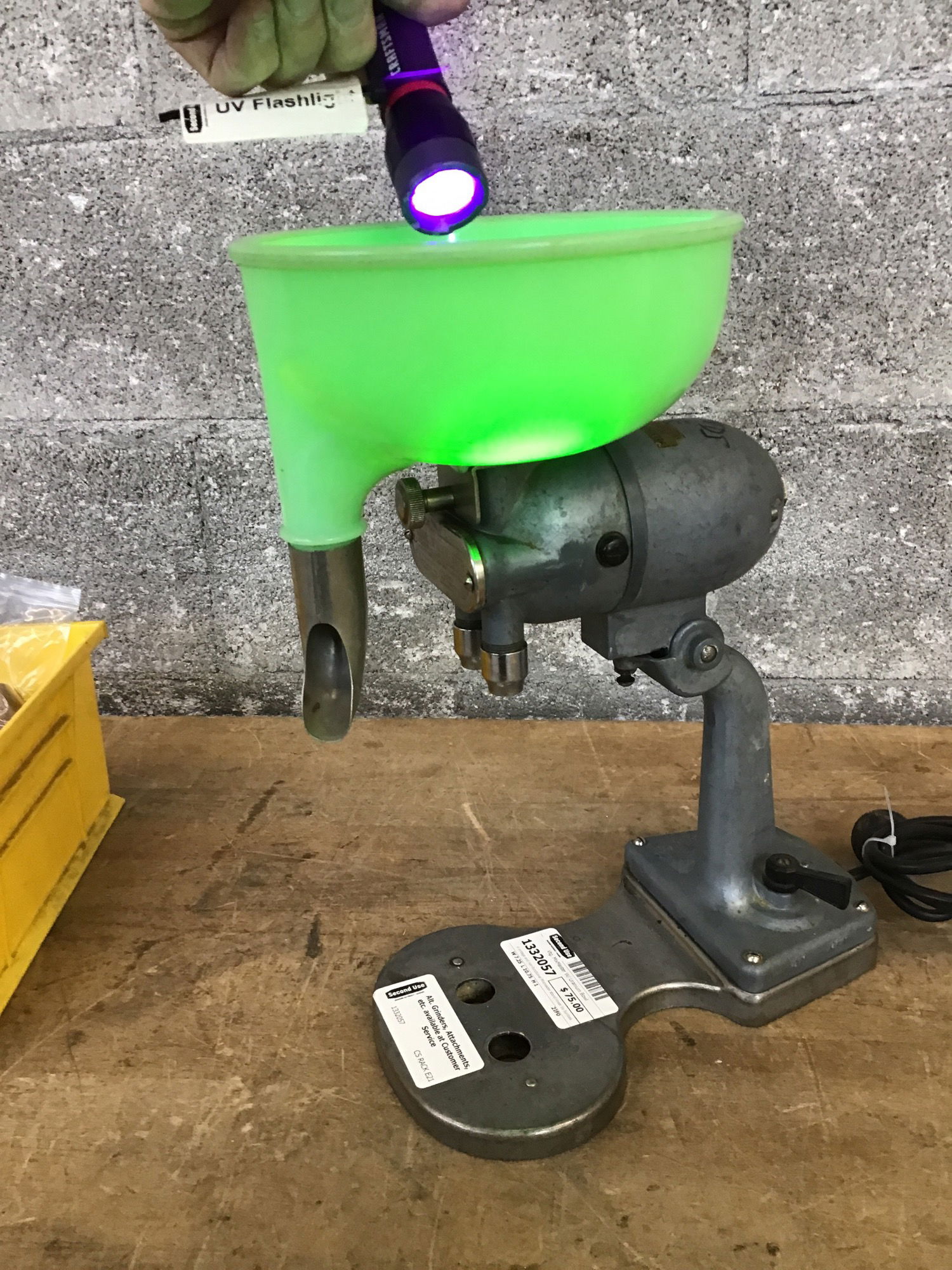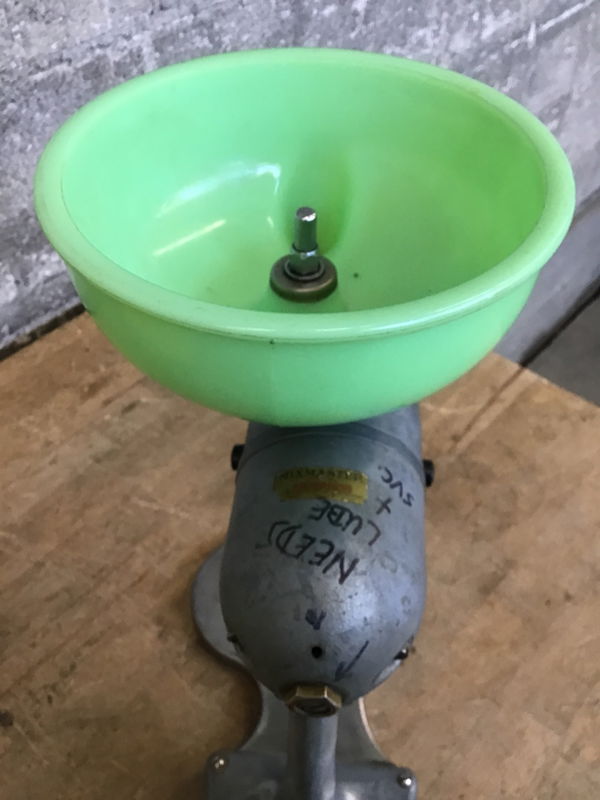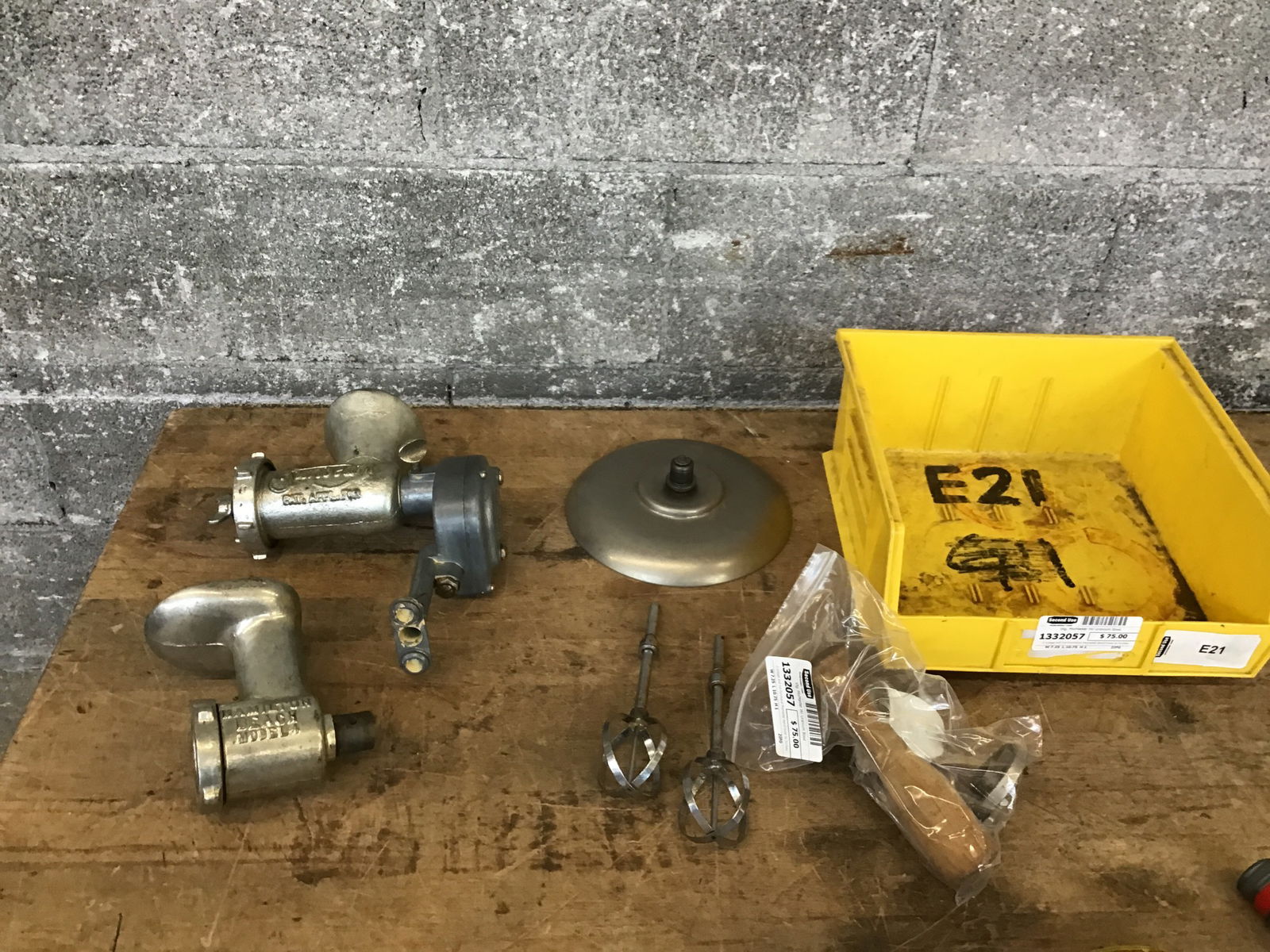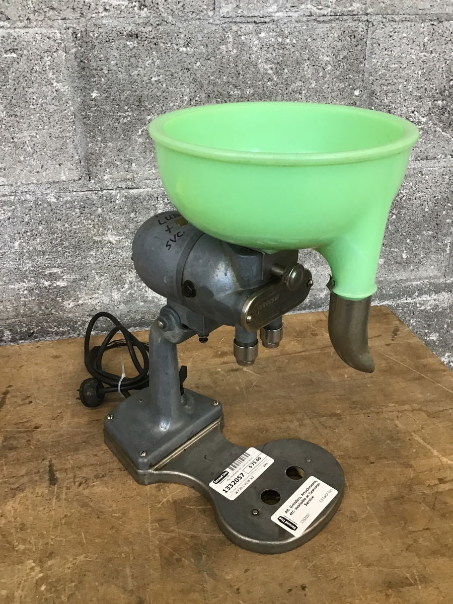 A vintage and non-functional Mixmaster stand mixer by Sunbeam, with a glut of attachments and parts for you to play with. It comes with a juicing bowl that mounts to the top that's made out of uranium Jadeite, two options for meat or grain grinding, a wooden muddler and other little bits and bobs. The cord for the Mixmaster is pretty thoroughly ruined, it looks like it may have melted at one point, so this piece is SOLD AS DECOR (as if you needed more reason to not use uranium to juice your oranges...)
