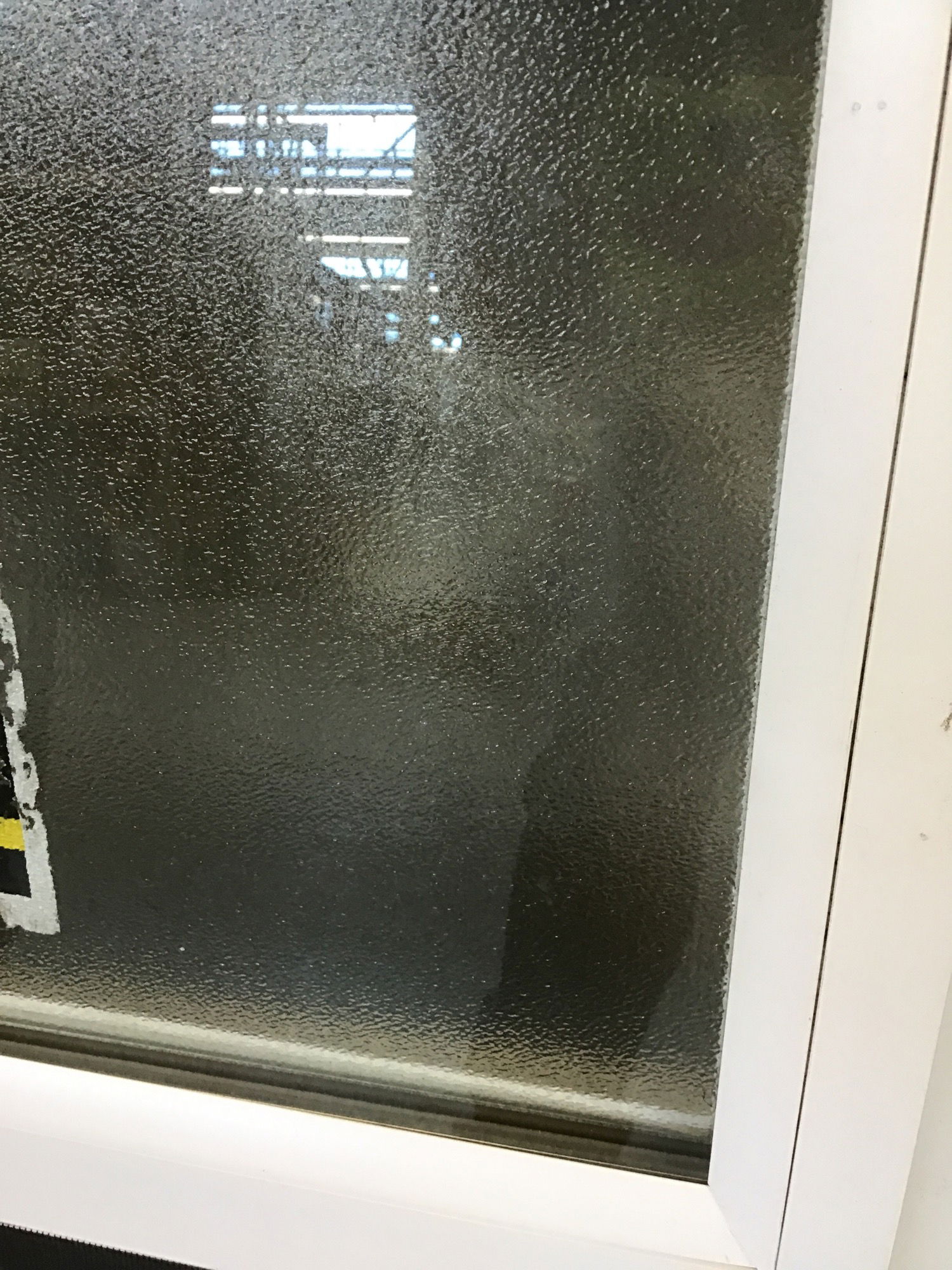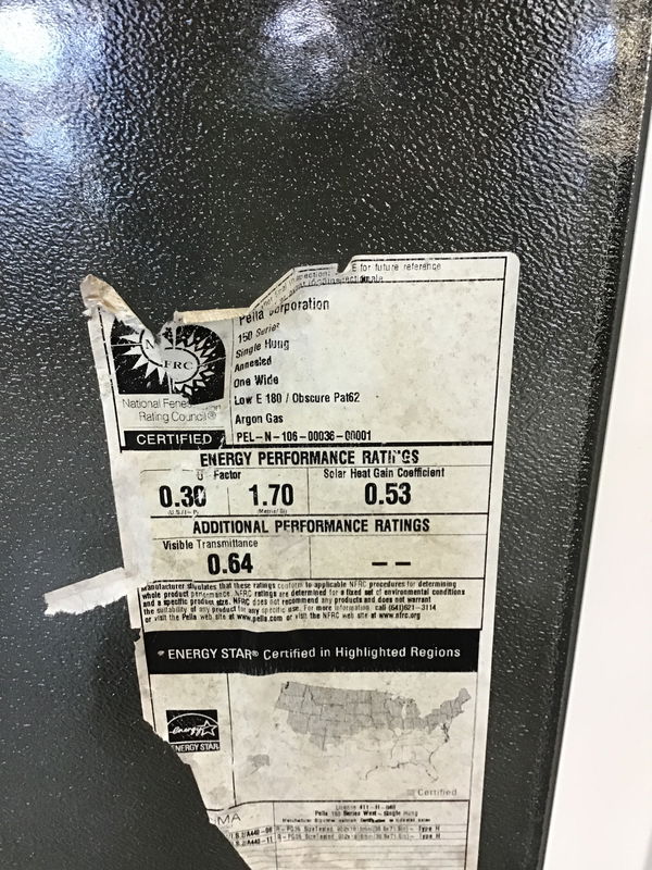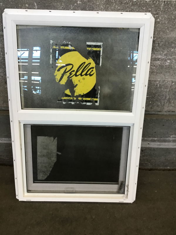 Guessing less than five years old, but left out in the rain for a while, never installed Pella white vinyl window with still readable energy tag. This one has obscure glass.
