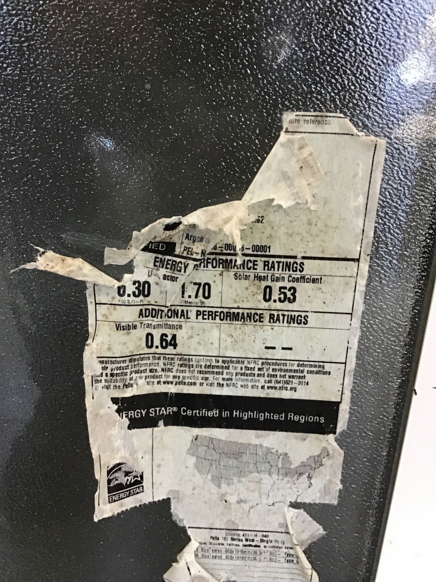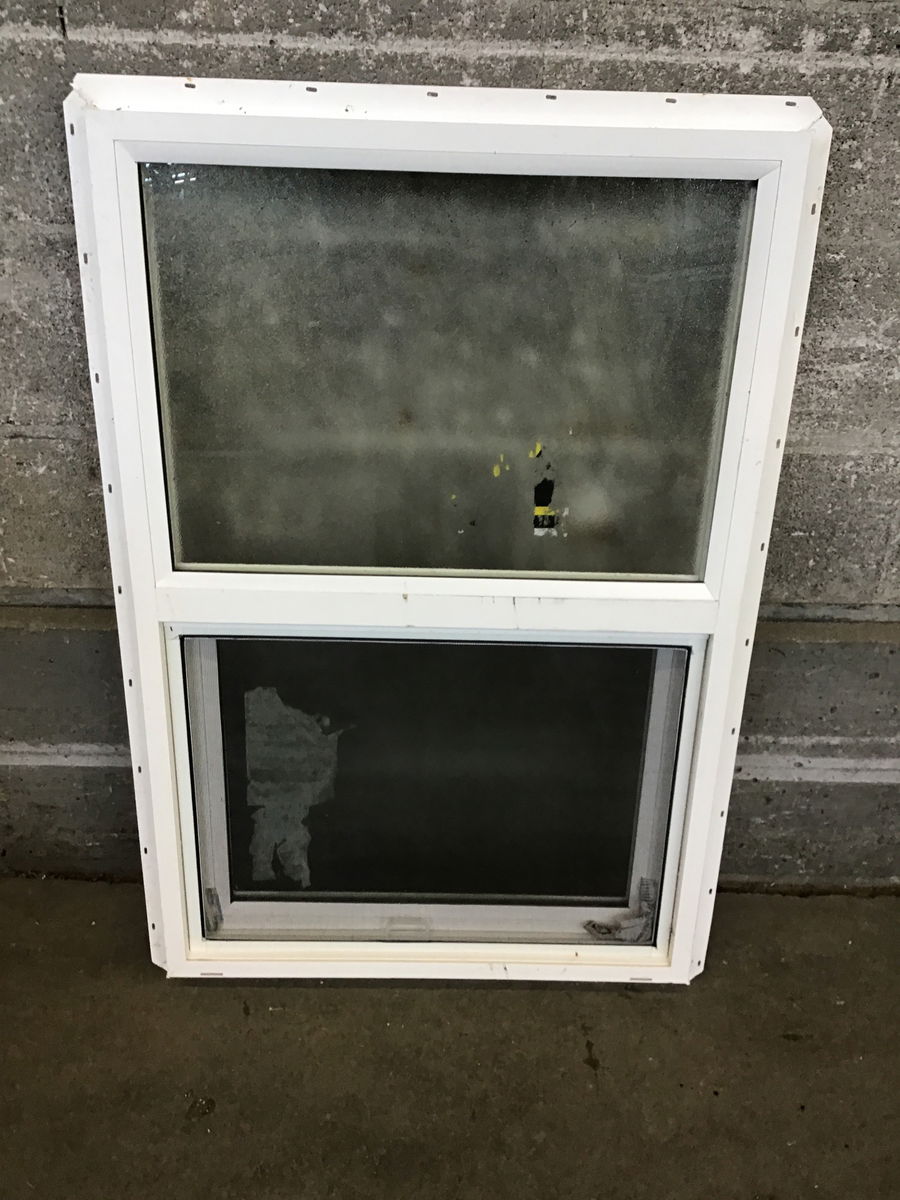 Guessing less than five years old, but left out in the rain for a while, never installed Pella white vinyl window with still readable energy tag. This one has obscure glass.