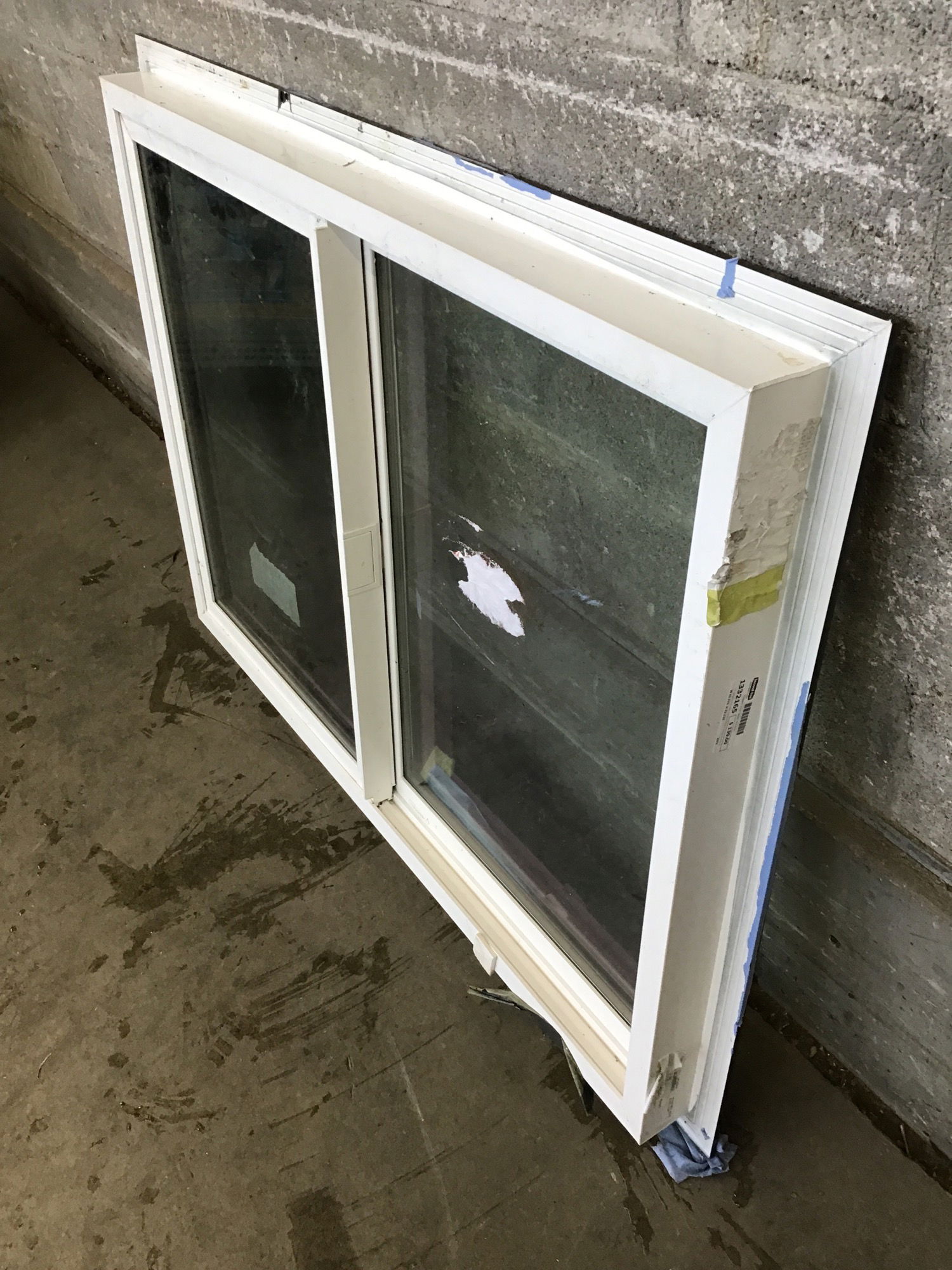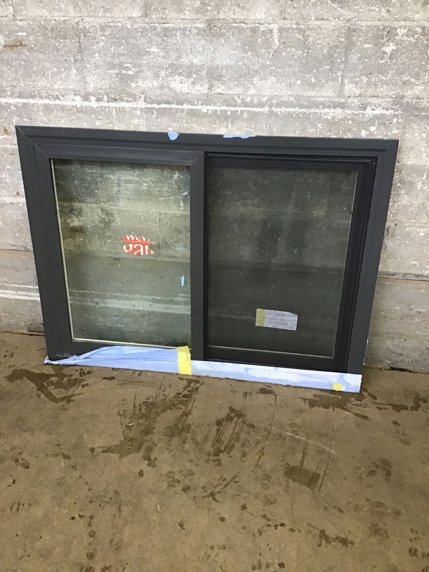 I'm guessing this never installed Milgard sliding window is less than five years old, but it was left out in the rain for a while. This model has a bronze exterior, with flush to outside of building trim flange, and white interior. There's no energy tag left on this one, but some red Milgard tag residue remains. Any blue you see in the photos is the leftovers of the tape Milgard wraps these windows to protect the exterior finish, which may now have some cosmetic damage.